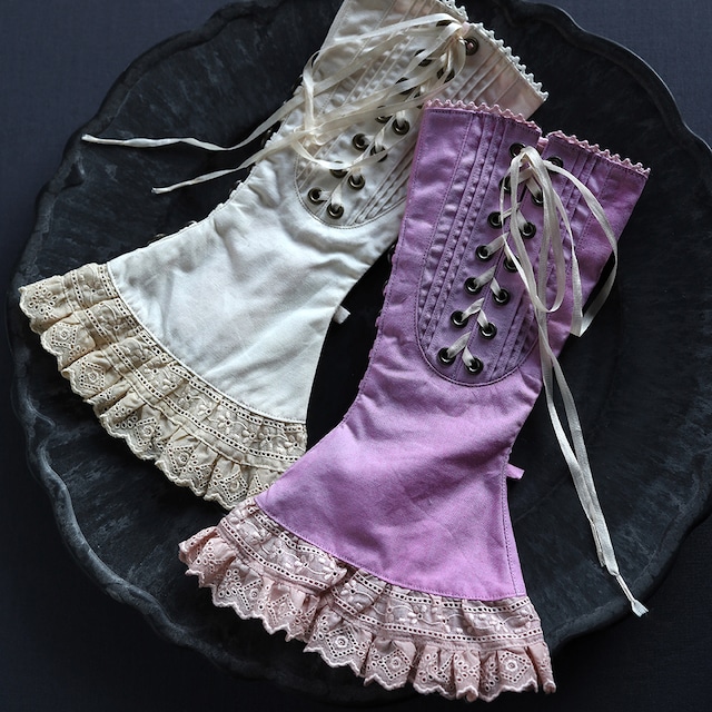 ★販売は先着順 ★転売目的のご購入はお控え下さいますようお願い申し上げます ★本品は【ご予約品】 ★発送は【ご予約から約1ヶ月後】に手配予定 ★備考欄に以下のサイズを記載願います [1]手首まわり [2]腕まわり(手首から7cm肘側の場所) ★【ゆうパック(60サイズ)送料込みのお支払い】となります ★単品注文の場合は、ブランドより直送 【ご注意】 「ご予約品」「抽選販売品」以外の「通常商品」について、他の商品と複数注文の際は、注文を分けずに一度にご注文ください。遅い納期に合わせて一括発送致します 別々に注文の場合、送料がその都度加算されてしまいますので、ご注意ください。別々に注文の場合、一括発送ができず、別々の発送となりますこと、ご容赦願います。 ★配送のご希望がある場合は備考欄にご記入願います ・曜日 ・時間帯【午前中】【12〜14時】【14〜16時】【16〜18時】【18〜20時】【19〜21時】 お日にちの指定は承ることができません * 霧とリボン企画・モーヴ街開通3周年記念イベント《菫色の実験室vol.8〜菫色×舞踏会》出品作品。 ・ー・ー・ー・ー・ー・ー・ー・ー・ー・ー・ー・ Text|massaging capsule 大人への憧れにときめいた時代の、 甘く遠い思い出を編み上げに閉じ込めるように—— 貴婦人が追想する、懐かしく淡い思い出の中の光景をイメージしてアームコルセットを作りました。 制作に際してはいつも、モチーフになるイメージと技術上のテーマの二つを同時に考えながら進めます。 今回の技術上のテーマは「デビュタントの軽やかさ」でした。コットン(黒は皺の目立たないコットンとポリエステルの混紡)とレーヨンを中心に素材を組み合わせました。柔らかく手首の締め付け感が少ない一重仕立てに、シンプルなファスナーで着脱する方式を採用しています。 淡い菫色のコットンレースで袖口を飾りました。編み上げのハトメ部分の内側にも淡い菫色の当て布がちらり。まるで身に纏うコルセットのような形に仕上がりました。 これまでご興味をお持ちくださって、でもまだ迷われていた方に、初めてアームコルセットにお手を通すデビューのひと組にお選び頂けましたなら幸いです。 ★作品情報 【黒】 [表地]ポリエステル65%綿35% [別布1 ]綿 100% [別布2]ポリエステル100%・レース 綿100%・コード レーヨン100% 【ナチュラル】 [表地]綿100% [別布1] 綿 100% [別布2] ポリエステル100%・レース 綿100%・コード レーヨン100% 作品サイズ|お客様のサイズに合わせて制作 ご計測をお願いする箇所|2箇所 [1]手首まわり [2]腕まわり(手首から7cm肘側の場所) 制作年|2023年 ★お取扱いのご案内 お洗濯は編み上げ紐を取り外しの上40度以下のぬるま湯で優しく手洗い、またはお近くのクリーニング店にご相談ください。 アイロンは当て布を使用し、低温・ドライでおかけください。 ★重要なお知らせ ご不在で商品をお受け取りできなかった場合は、必ず【7日間以内に配送業者さんにご連絡の上】お受け取りをお願いします。 ★返品・交換について 作品や商品に不備があった場合は、商品到着後、7日以内にご連絡願います。作品については問題解決後にお届け、商品については良品と交換させて頂きます。但し、代替品をご提供できない場合は、交換ではなく返金対応とさせて頂きます。返送や交換にかかる送料は当方で負担します。 お客様のご都合による返品は受け付けておりませんので、ご不明な点はご注文の前にお問い合わせ願います。 *画像の色味はできる限り現物に近づけておりますが、ご覧頂く環境により見えは変化します。ご了承願います。