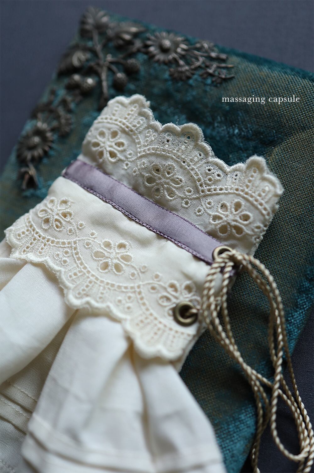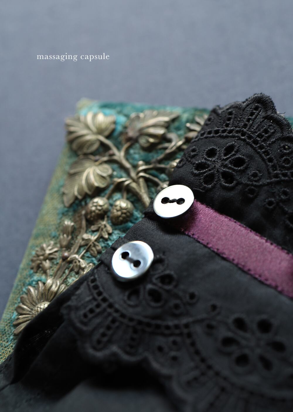 コットンレースを対称に継いだ中央には、アリスがつけてあげたかった首輪みたいに菫色のリボンを渡しました。そしてもちろん、お袖のフリルからちらりと覗くピコトリミングもお揃いの菫色です。真鍮ボタン二個ずつと共布ループでの着脱で、ティータイムにも纏って頂ける軽やかなアームコルセットを目指してお仕立てしました。
