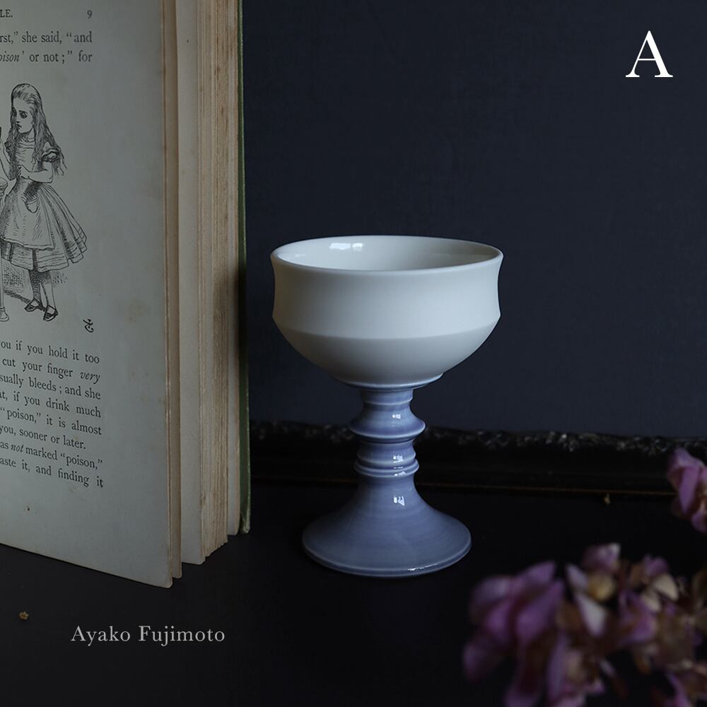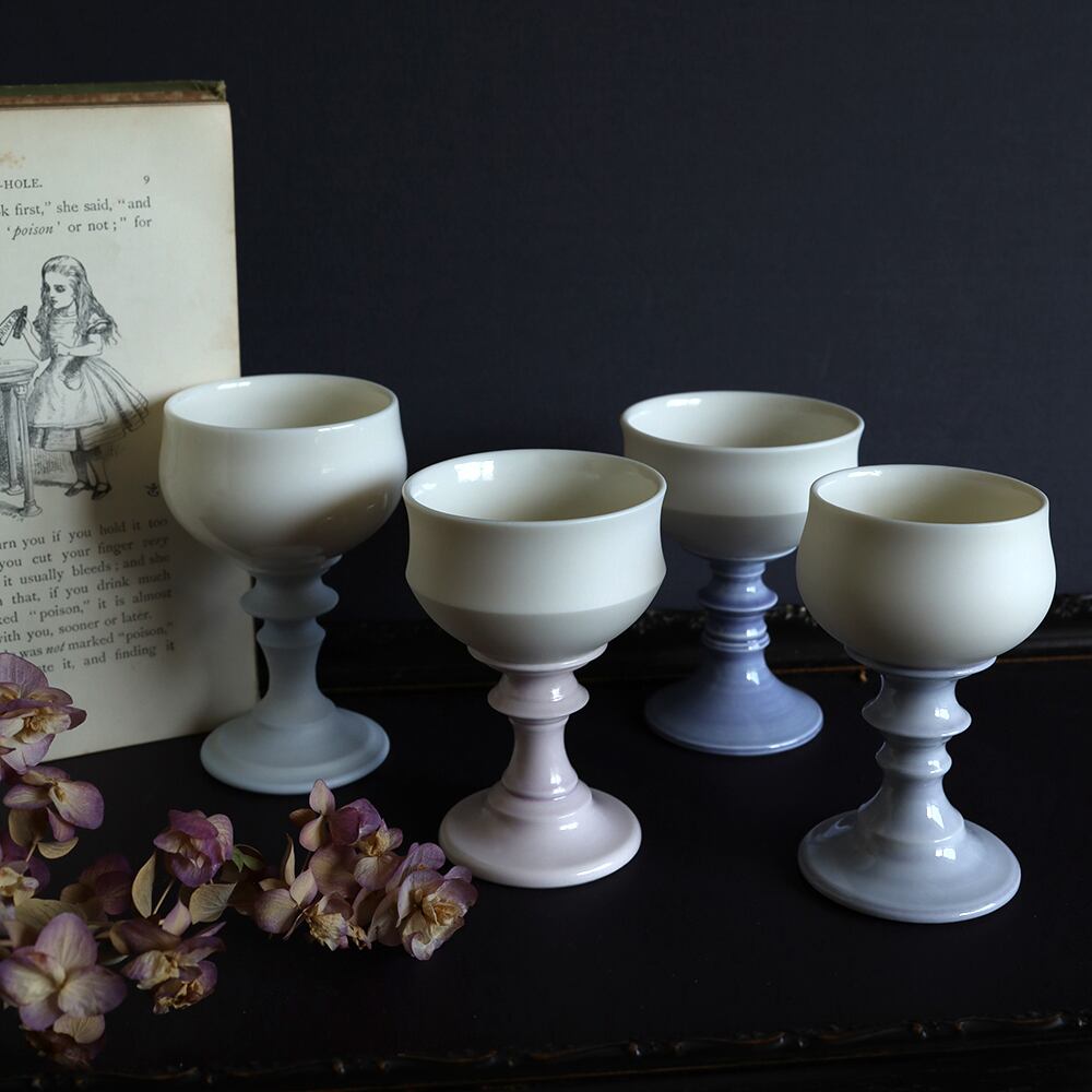 白いボウル、ステムとフットプレート部分はアリスのドレスを思わせる3種類の青菫色、そしてピンクの計4種。