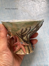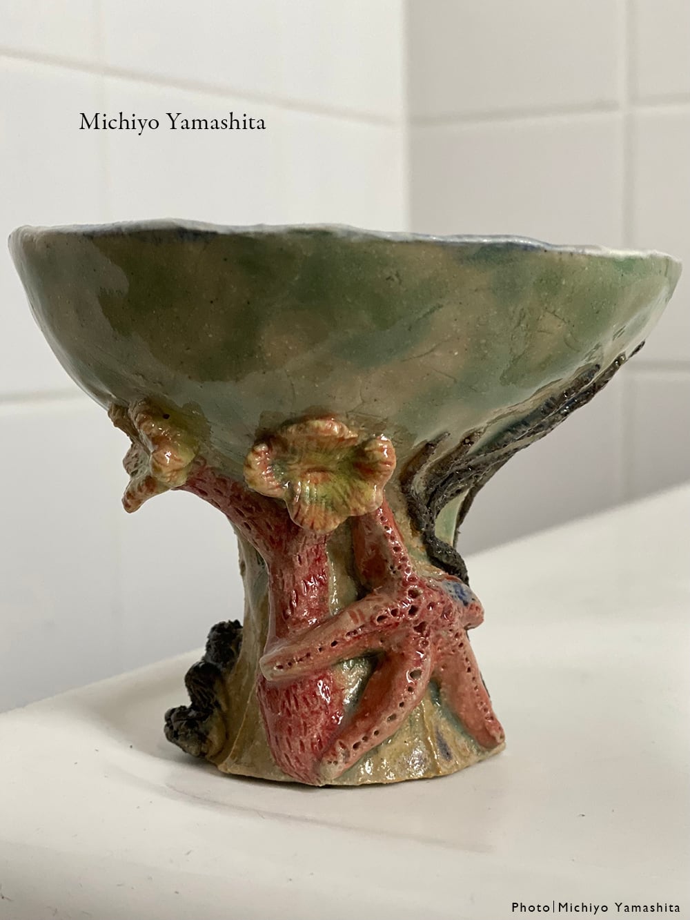 蒼い湾を宿す人魚の瞳を、そっと8つの椀に浮かべて。貝殻のふちをなぞるように、しずかに波打つ杯。山下美千代さまの作品には、風と海に導かれて生まれた眼差しが練り上げられています。夢のなかで人魚の娘が見せた、深い海の底の記憶をたどるように、ワインや紅茶をその中に浮かべて――人間の手からこぼれ落ちた神話が、そっと耳殻を震わせる。