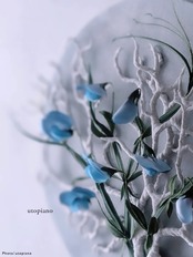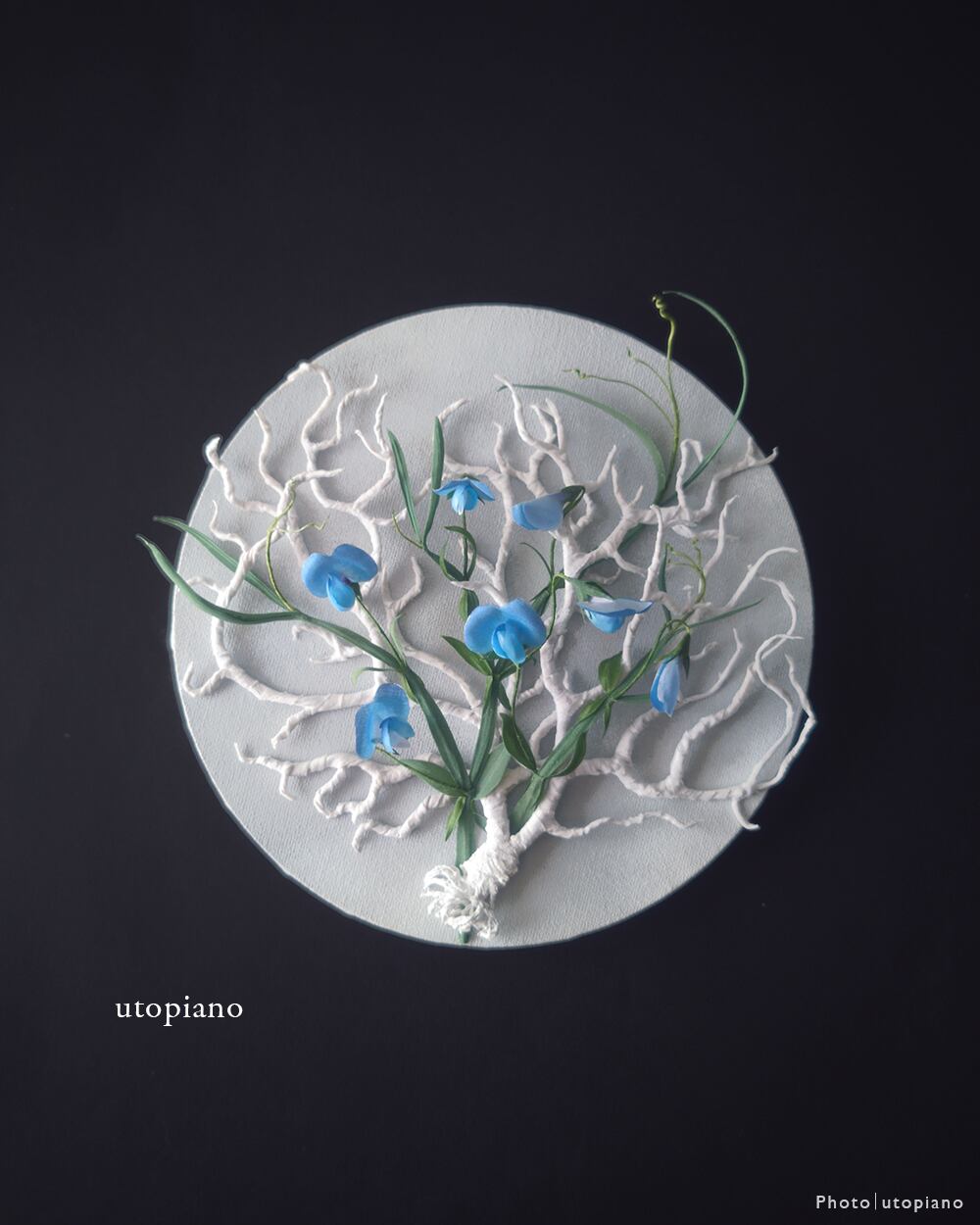 人魚の唄のお話を伺った時に浮かんだのは、陸に引き上げられ色を失った珊瑚と、風に揺れる青い花のイメージでした。