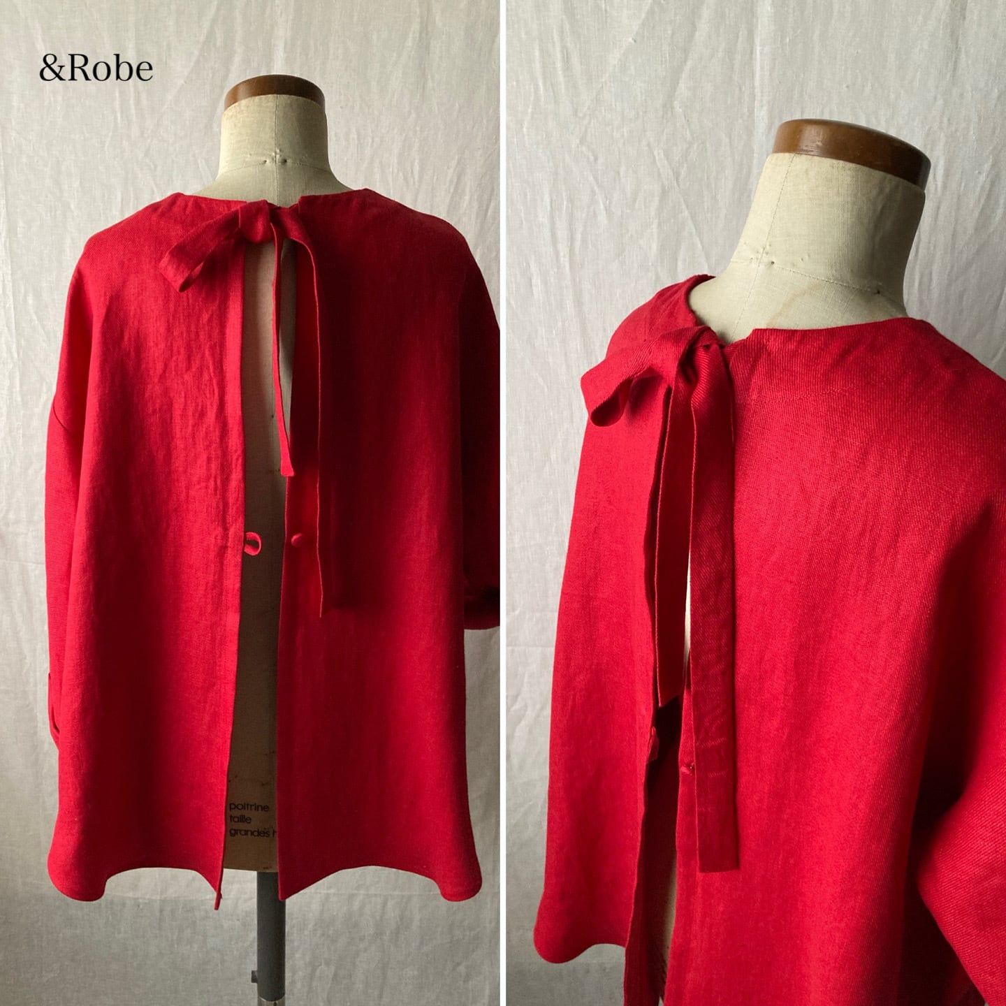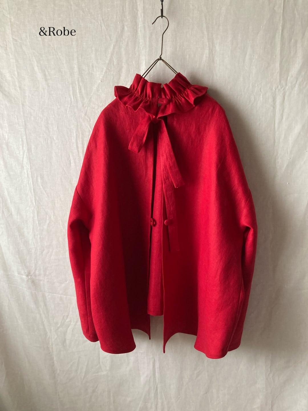 探し続けていた、くすみのない鮮やかなレッドに出会えました。しっかりとしたリネンツイルなので、風よけにもなる可憐なガーデンスモックにしようと思いました。身体のラインを拾わず、ややAラインシルエットがきれいに出ました。