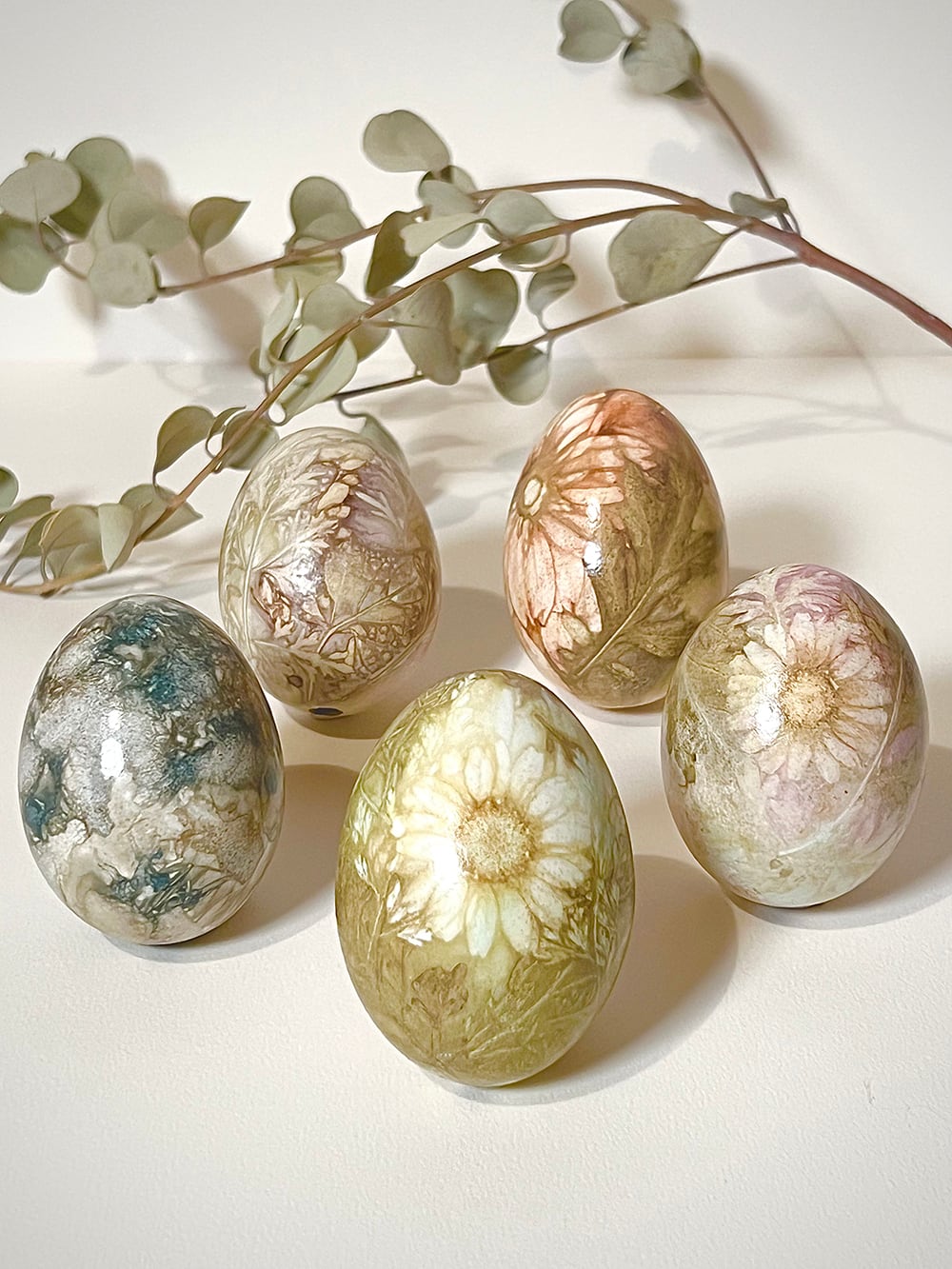 特殊な技法で花や葉を染め移した不思議な卵。