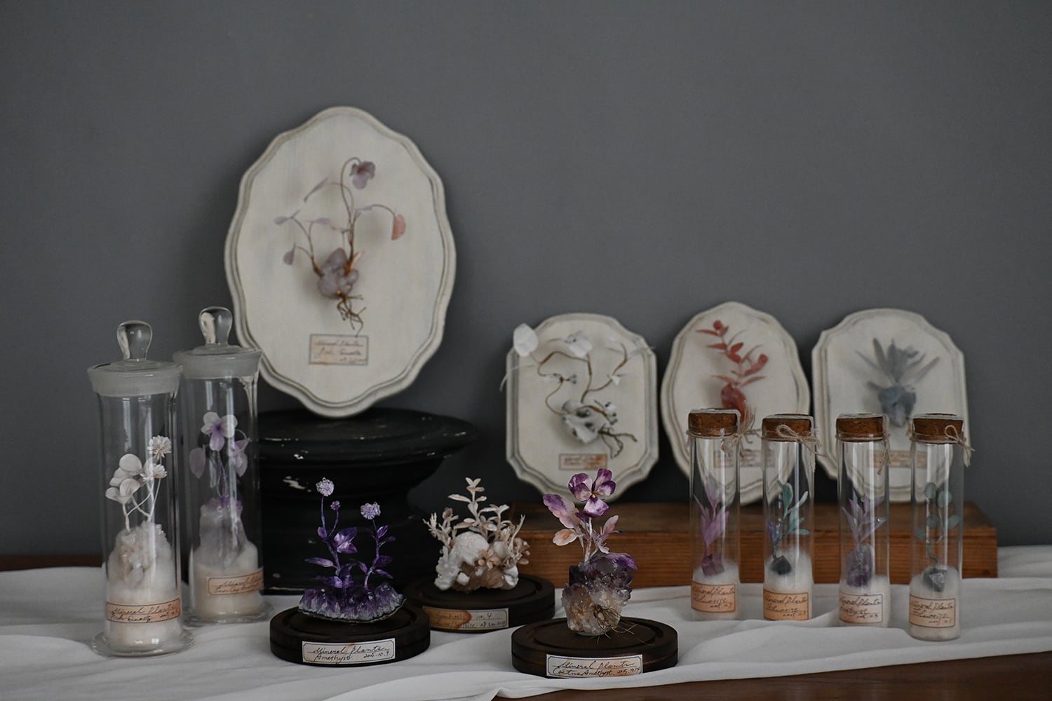 自然の造形美と空想を掛け合わせ、再構築した姿を「空想植物標本」として制作しています。石や化石と対話をし、地球の欠片である彼等の夢を具現化しています。ささやかなファンタジーをどうぞお楽しみ下さい。
