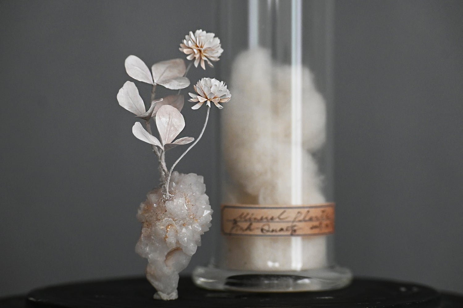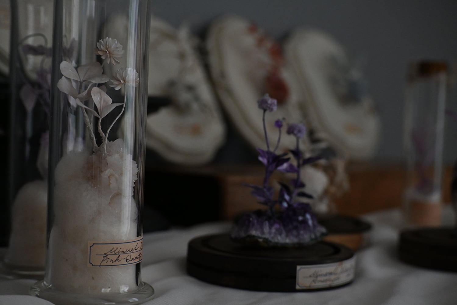 標本瓶の内でも瑞々しく、生命が滴るのは鉱物花ならではの美しさ。錬金術師は永遠の命を求めながら、この世界への敬意を混ぜ合わせているのです。