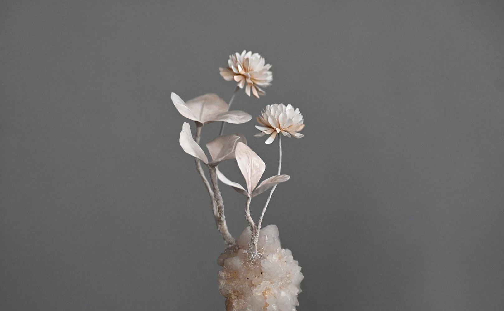 霧とリボン企画初登場となる紙の造形作家・kopfkinoさまの作品をご紹介いたします。鉱物と植物、空想と化学を混ぜ合わせる――アルケミストの可憐な一室を覗いているような作品たち。自然科学とアートが融合する本企画で、その美しい鉱物花を咲かせます。