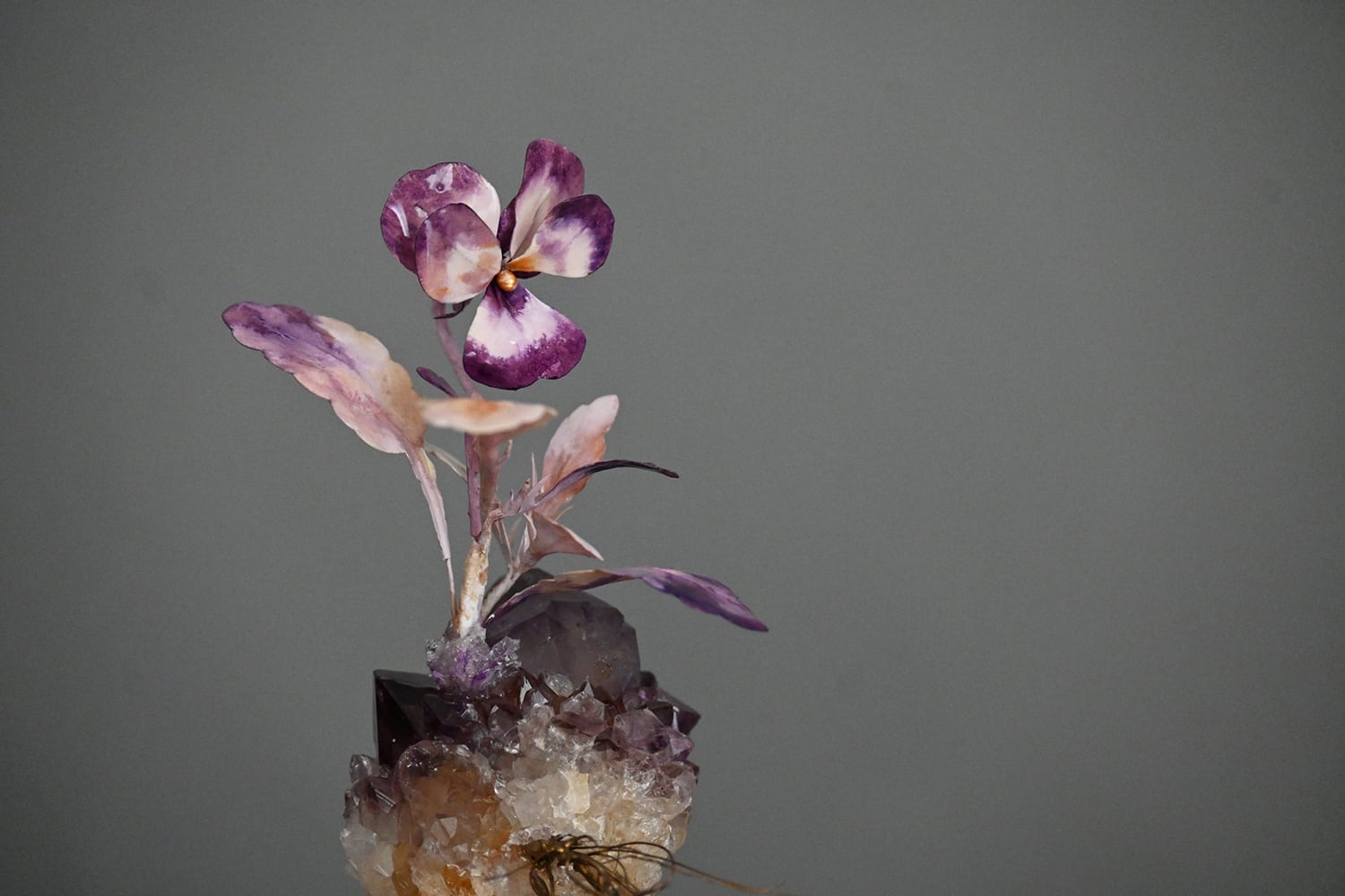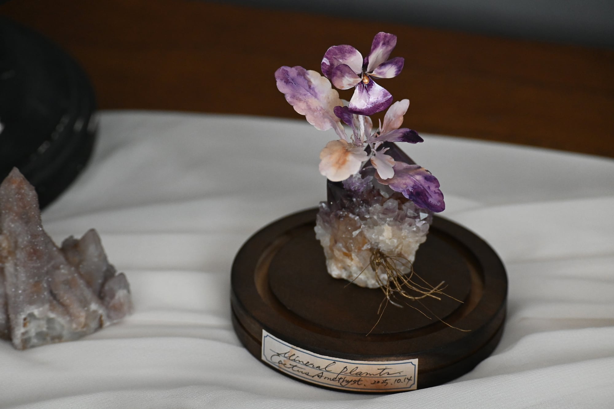 深い紫色からのグラデーションと大きな結晶が美しいカクタスアメシストと、ヴィオラが共生した「空想植物標本 鉱石植物シリーズ」のガラスドームです。