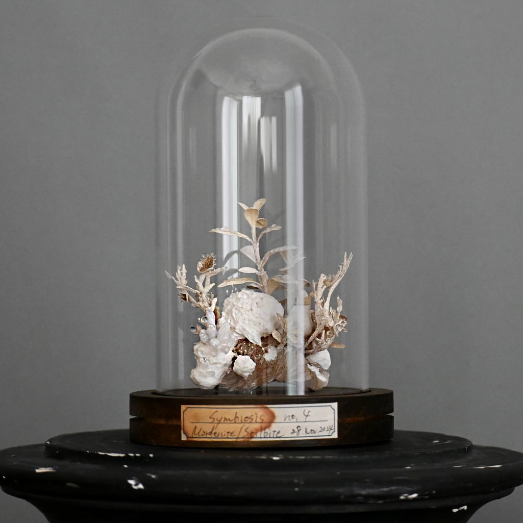 可愛らしいポコポコとしたモルデナイトと、植物や地衣類、粘菌類など生命の息吹を宿した「共生標本シリーズ」のガラスドームです。