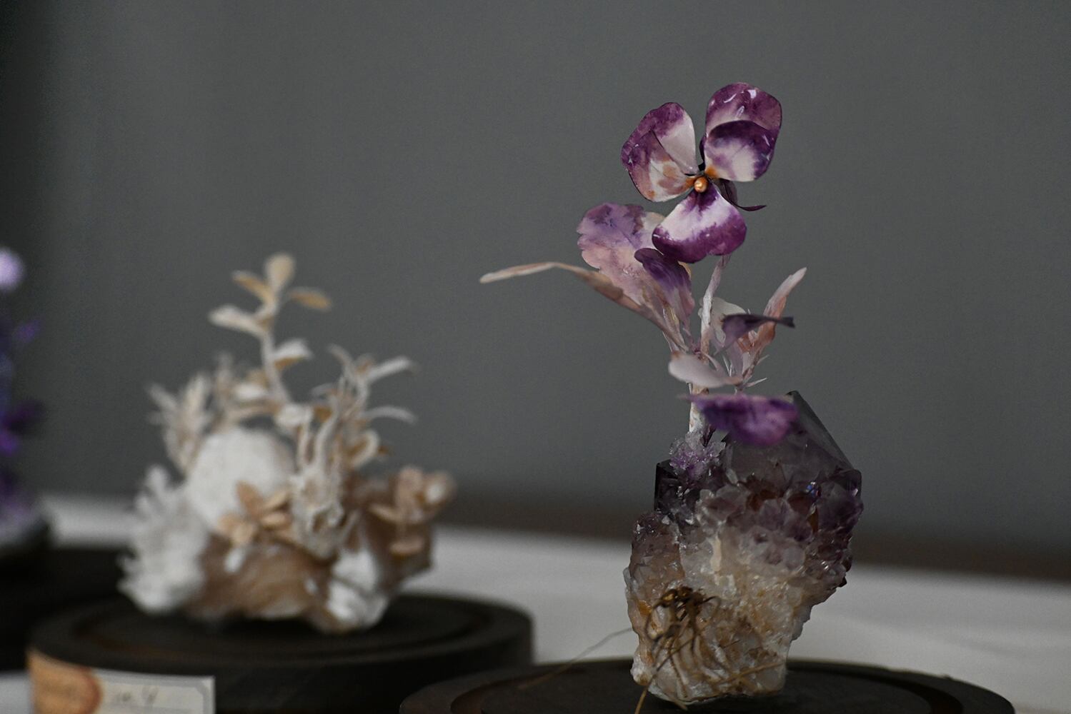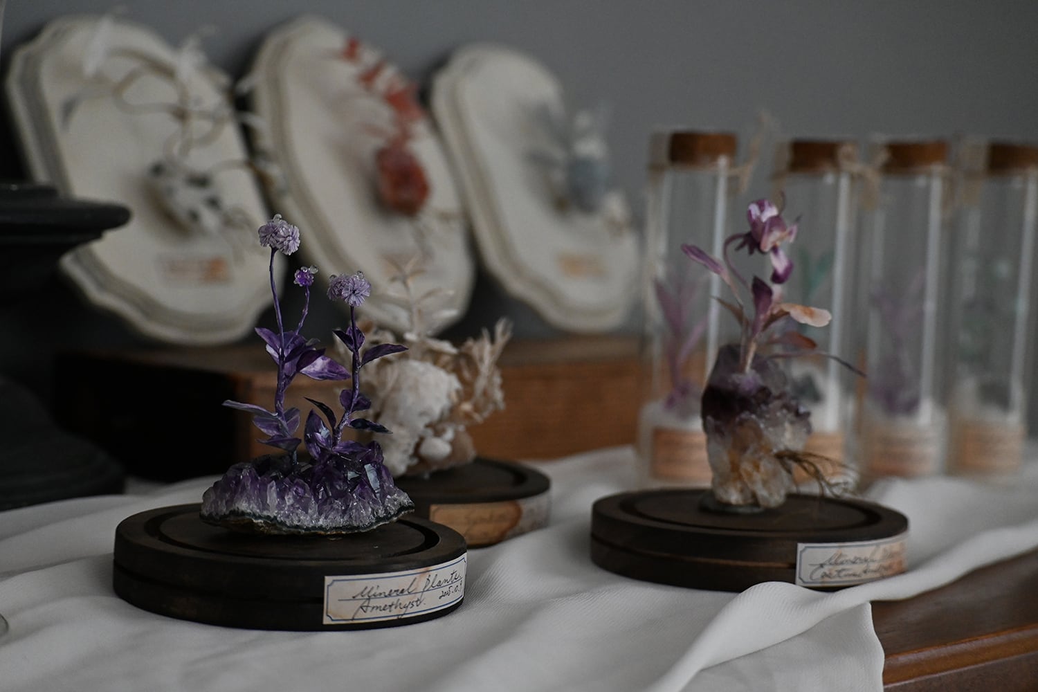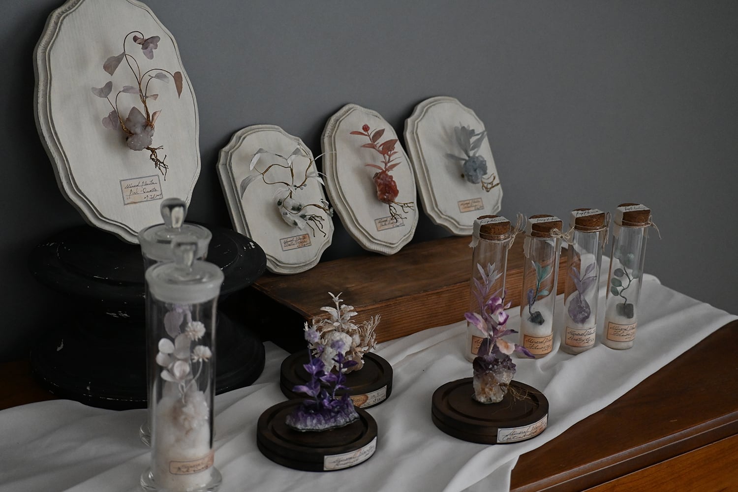自然の造形美と空想を掛け合わせ、再構築した姿を「空想植物標本」として制作しています。石や化石と対話をし、地球の欠片である彼等の夢を具現化しています。ささやかなファンタジーをどうぞお楽しみ下さい。