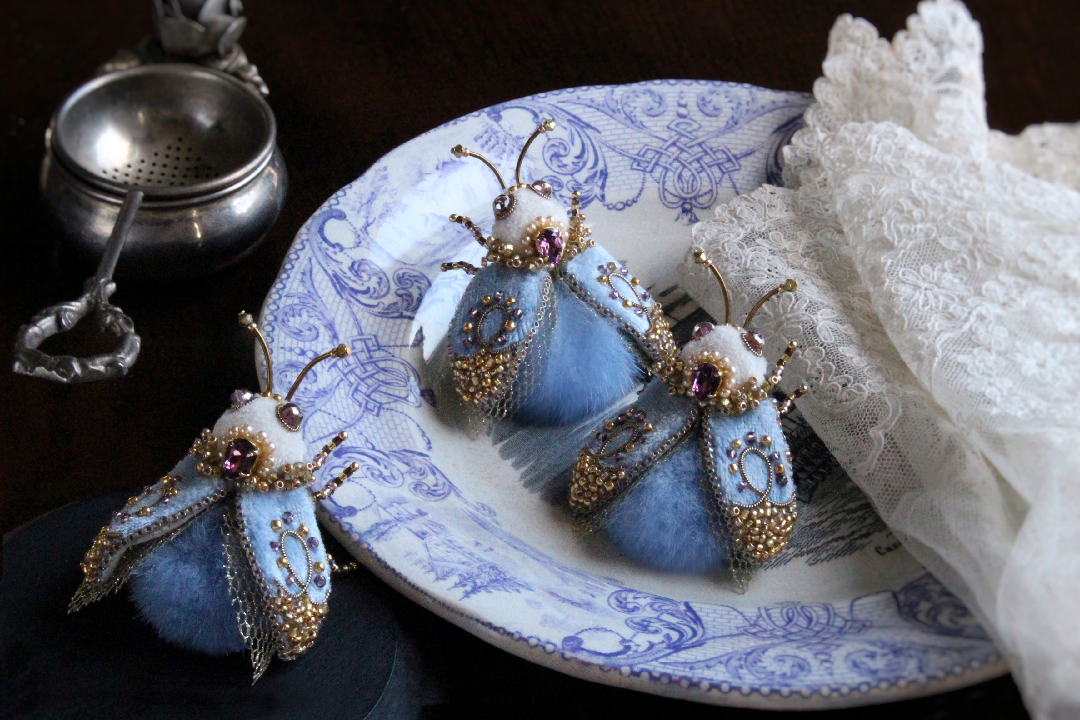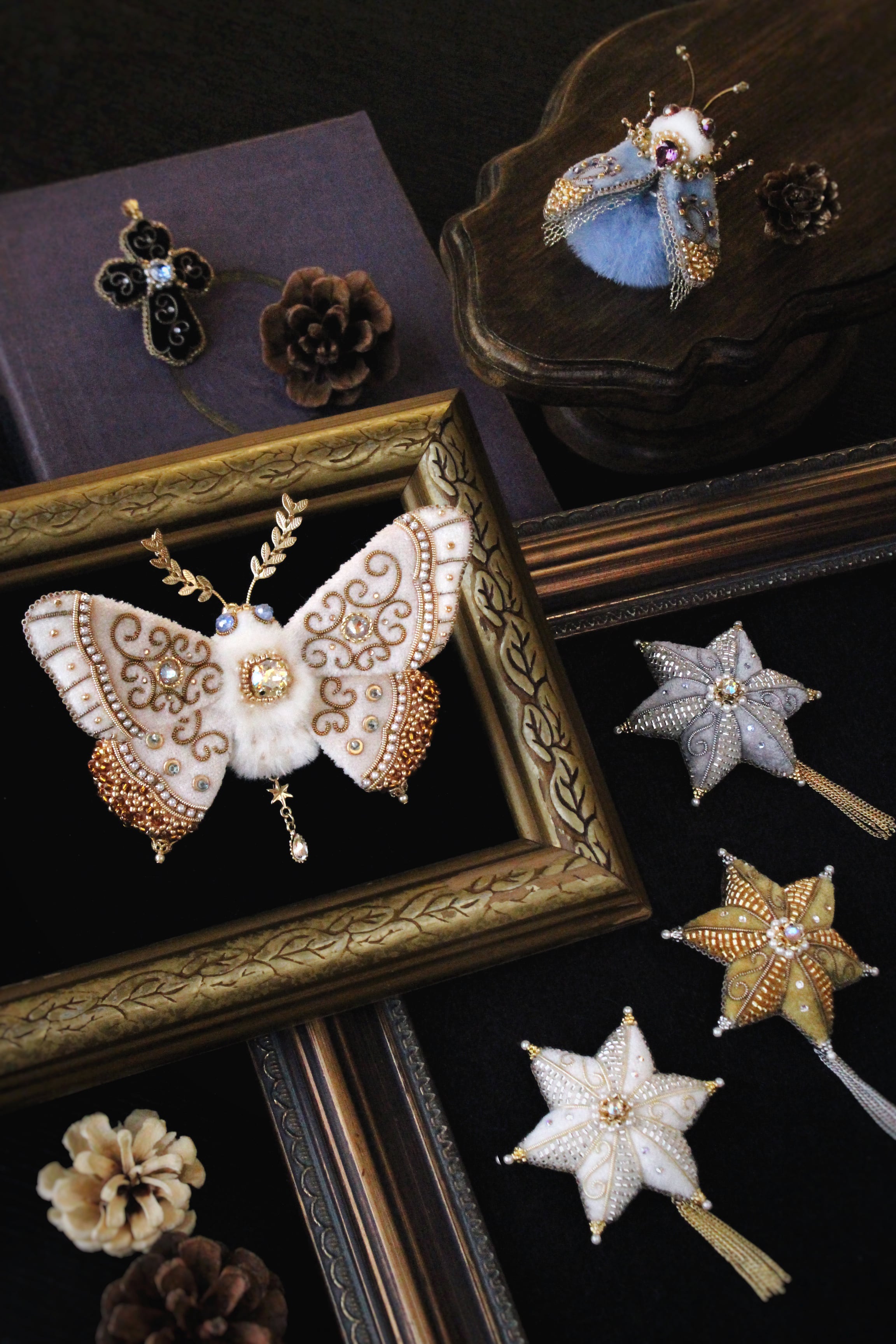 ★8枚目画像は本展全出品作。お届けする作品は《ビーズ刺繍の昆虫ブローチ No.51「セルリア スレーヌ 」》のみとなります。