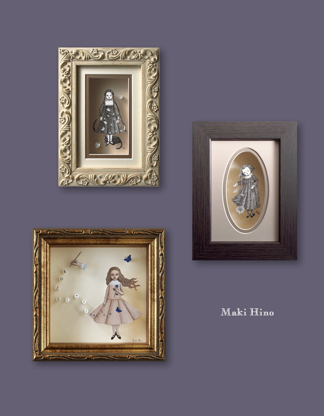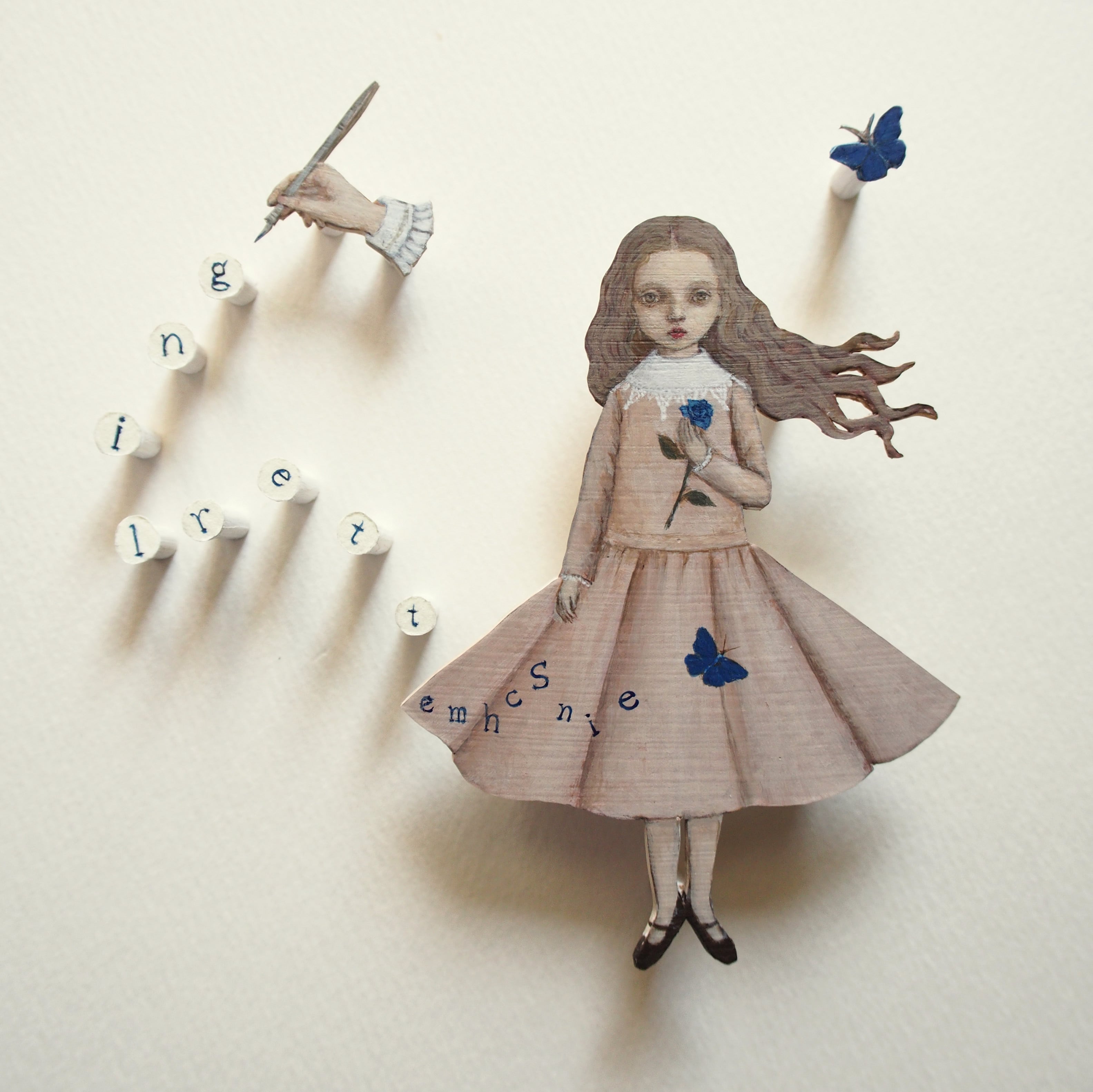 アクリル絵具で人物、動物などを描き、切り取って紙の人形を制作。彼女たちの服の中で物語や詩を表現している。