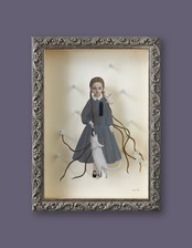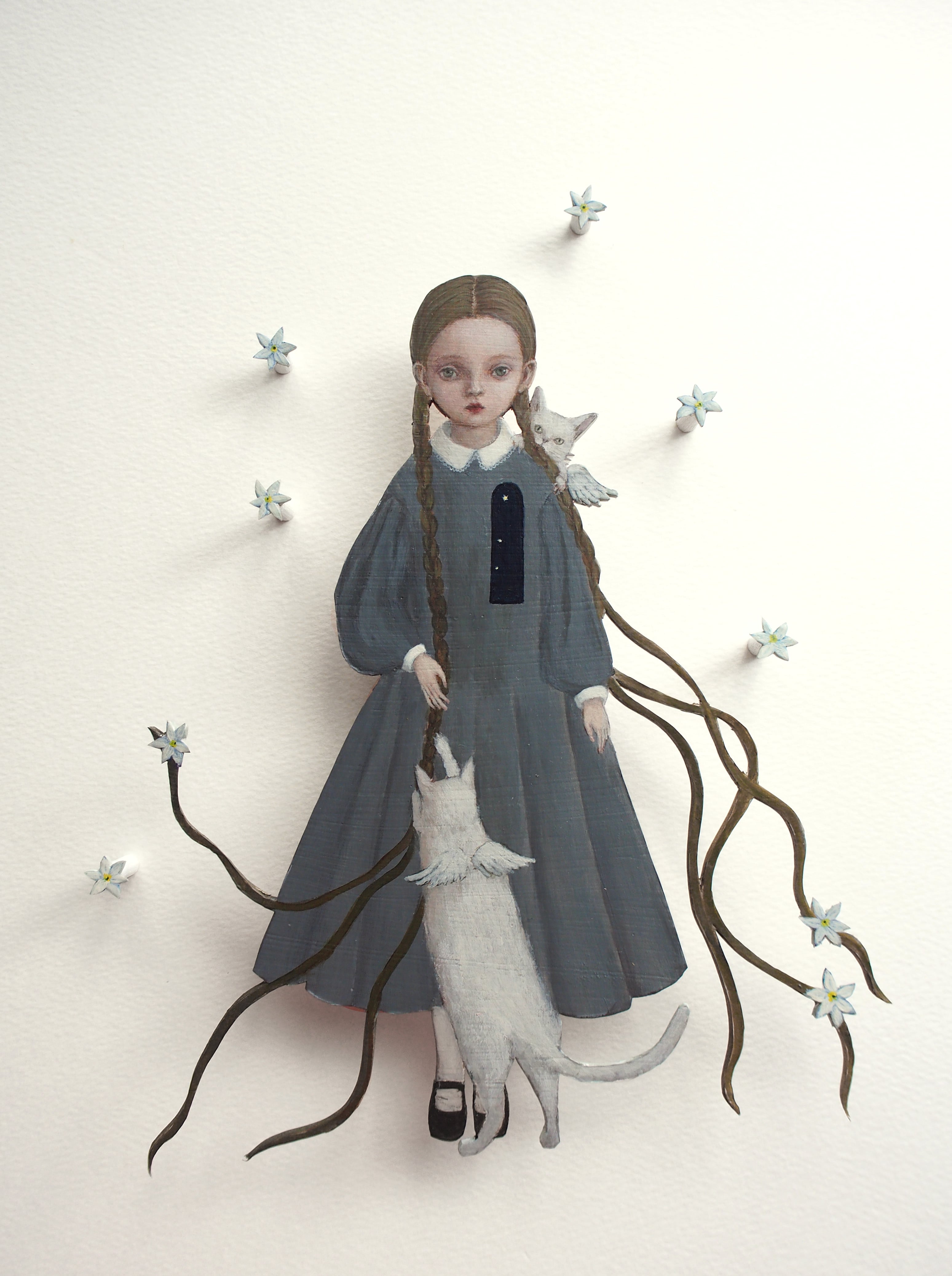 アクリル絵具で人物、動物などを描き、切り取って紙の人形を制作。彼女たちの服の中で物語や詩を表現している。