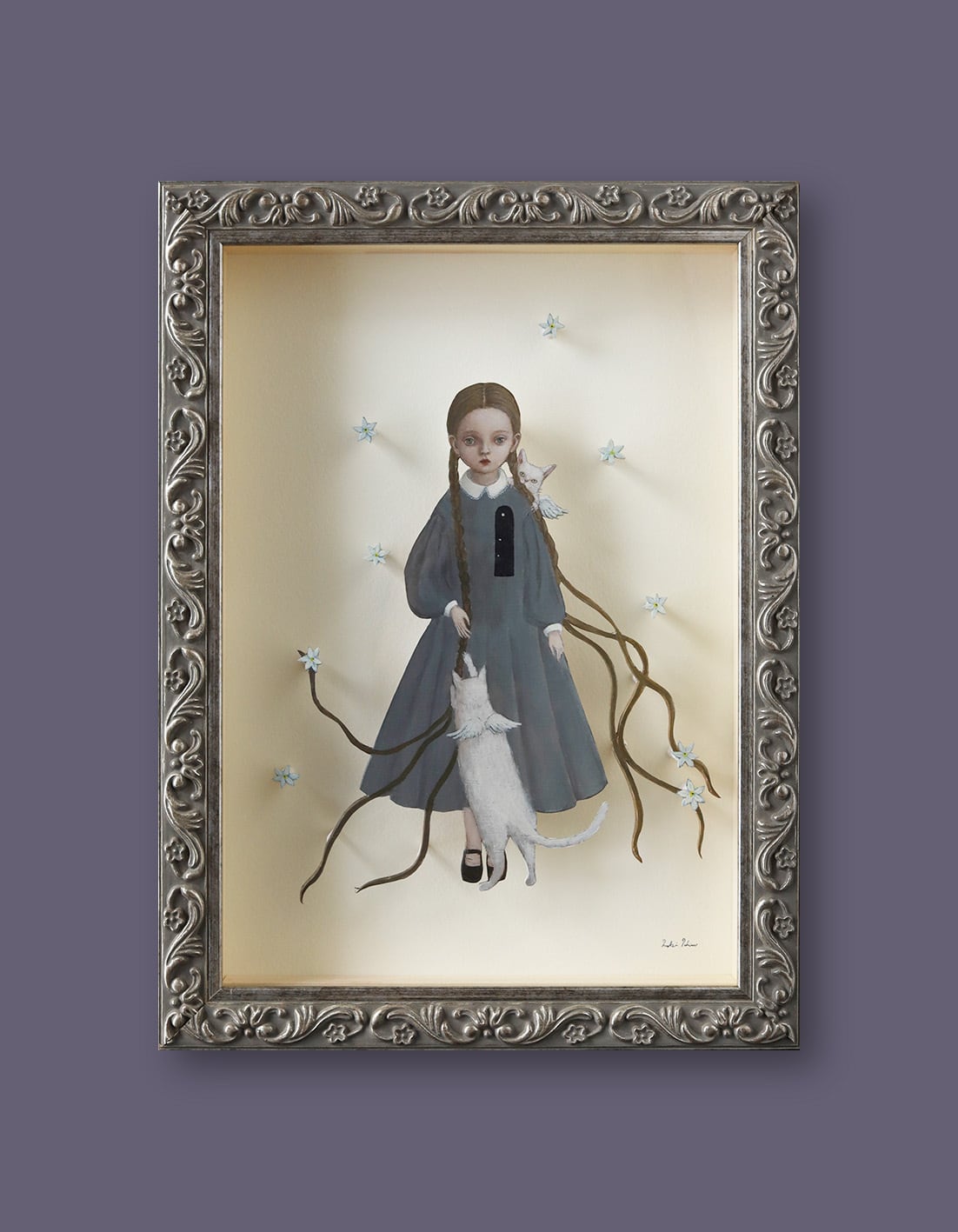 優しい筆が撫ぜる紙の質感そのものを感じて──紙の素材によってゆらりと浮かび上がる世界は、現実の中に虚構の香りを立ち上らせる。日野まき様の霧とリボンでは初となる個展《詩人の指さき》、少女たちの夢の中のような作品をお届けいたします。