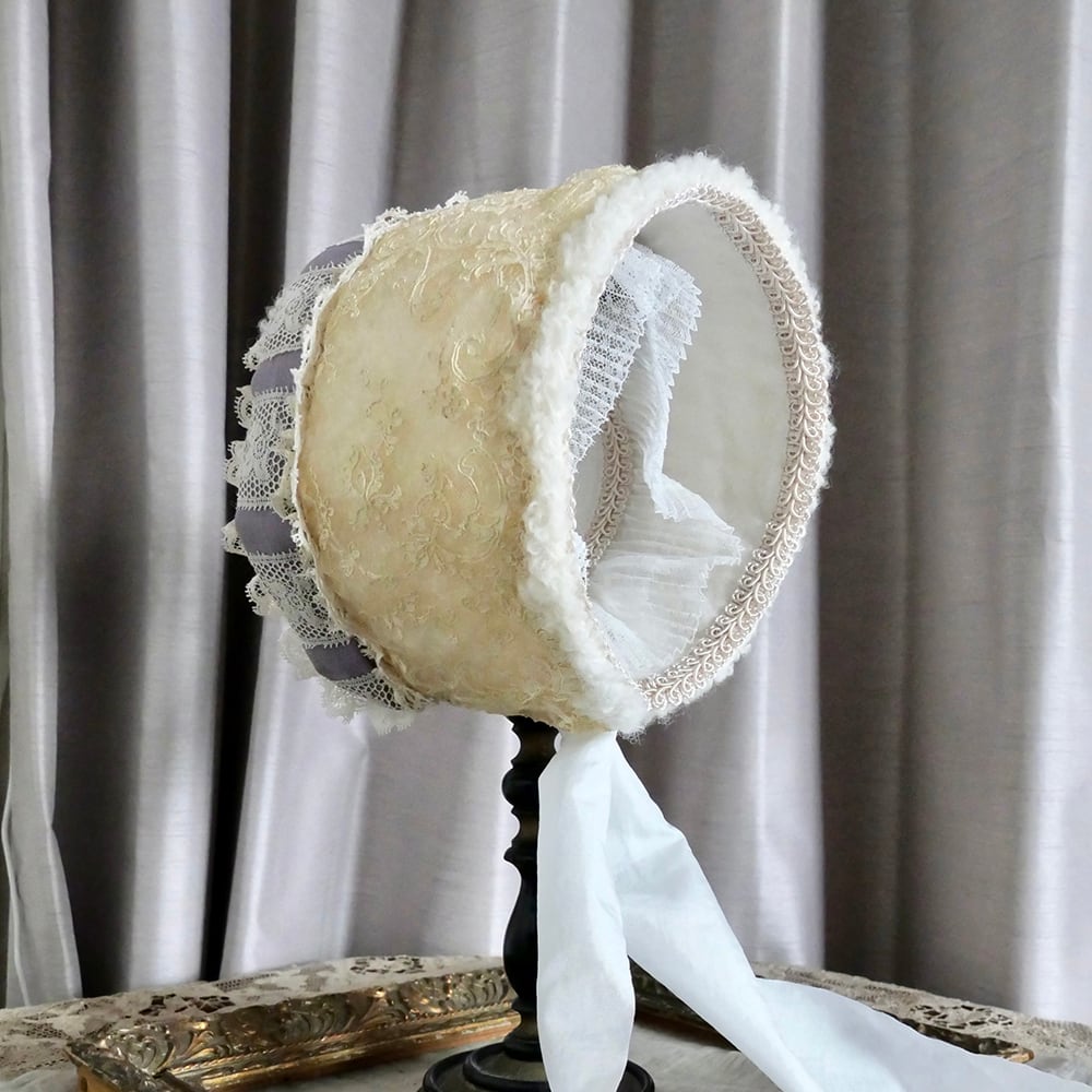 ファーとアンティークレースの組み合わせが可憐な印象のハーフボンネットです