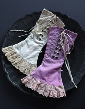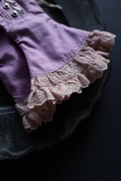 綿素材に強く洗いをかけて馴染んだ風合いを出し、生地とレース、そして当て布は染色しています。ほんの少し薔薇色を帯びた、均一ではない揺らぎのあるスモーキーなモーヴ色に染めました。