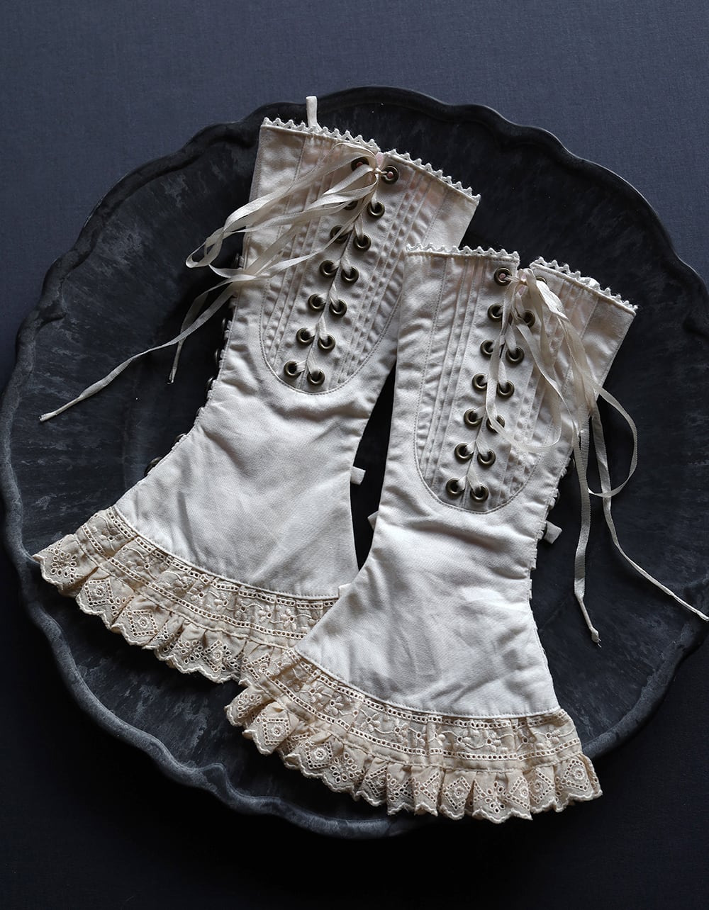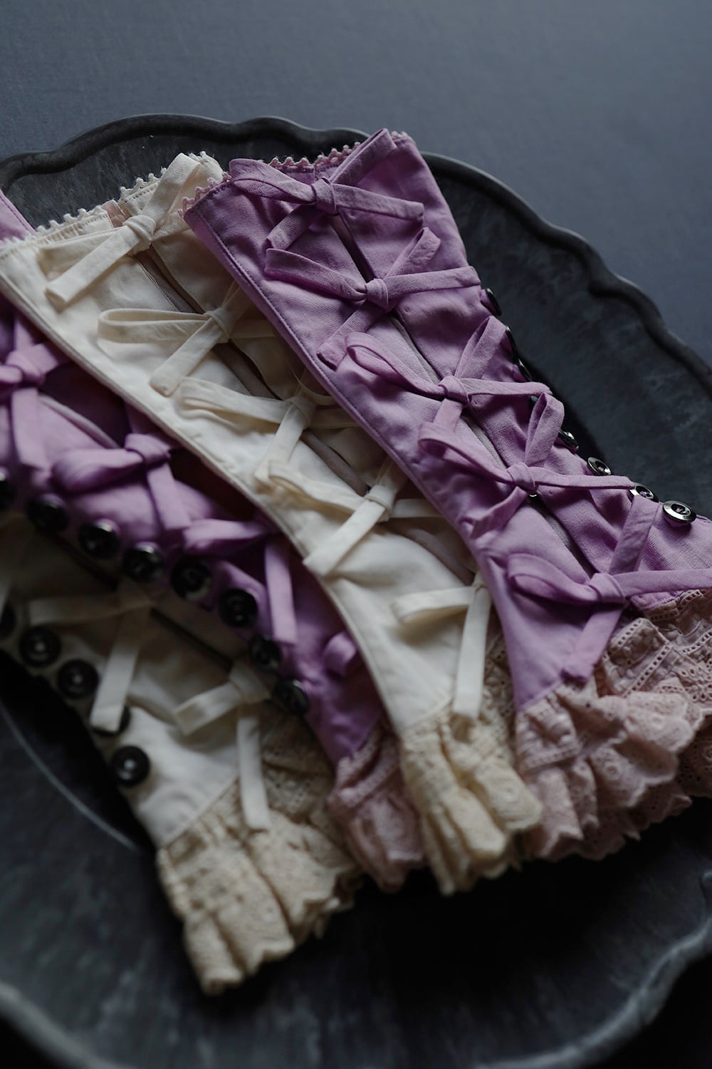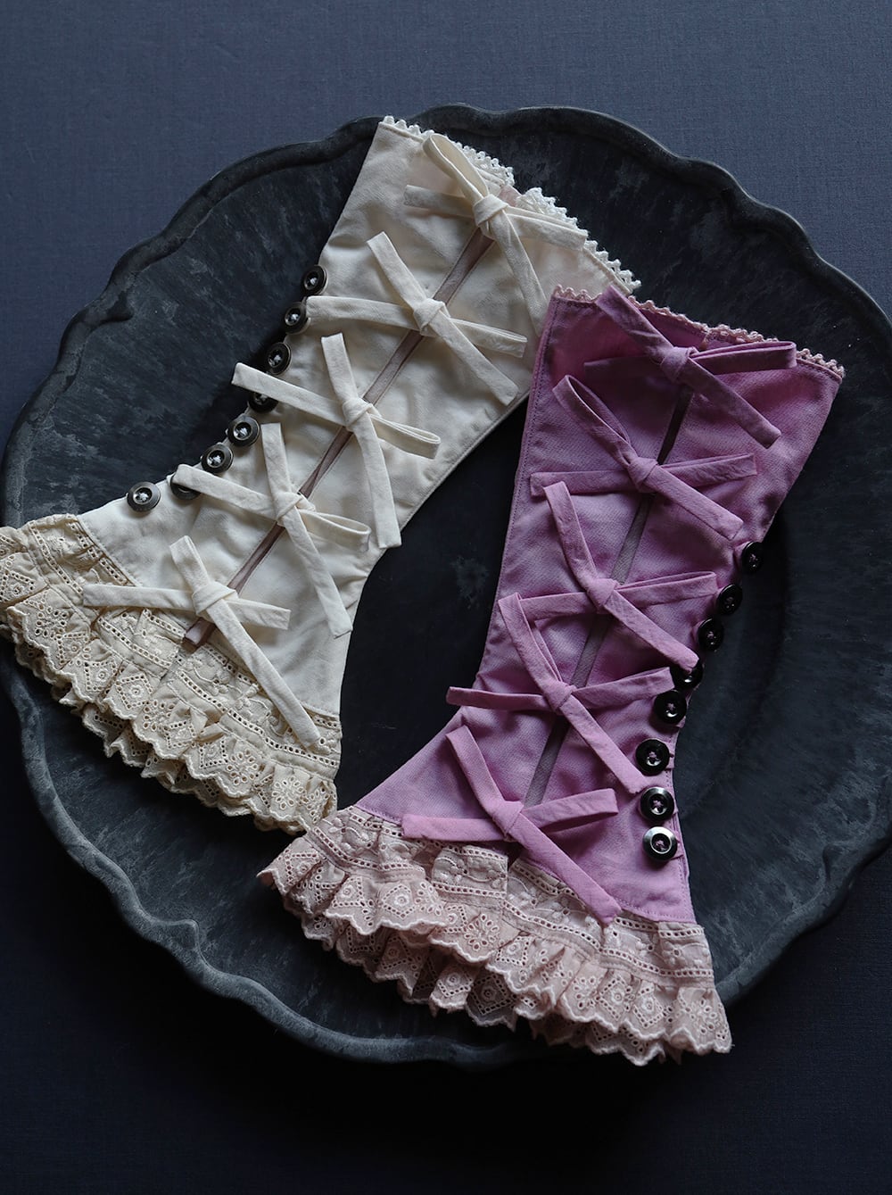 生成り色のレースも時間を経たようなベージュ色に染めています。表側には細いピンタックを3本ずつ左右に施してラウンドにはめ込み、背面には手術ガウンのようにキュッと結ぶリボンを配しました。装飾だけでなくサイズ調整の役割も兼ねています。サイドに8個ずつ並んだボタンループと金属ボタンで着脱できます。