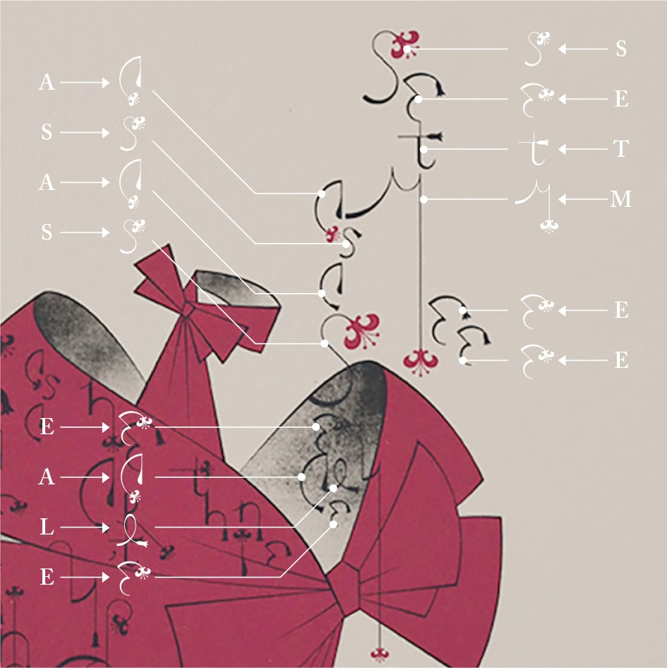 「雅歌」に登場する百合は、パレスチナに多く咲くスカーレット・マルタゴンであるという説が最も有力とのこと(『聖書の花』阿部薫・八坂書房より)。お花の造形を書体に写してみました。