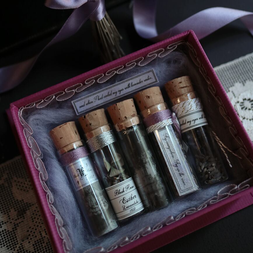 ロンドンに到着する前に目元にラヴェンダー香水を付けたエピソードにちなみ、ラヴェンダーのポプリが封入されています。コルクの蓋を開けて、清楚な香りをお楽しみ下さい。小壜は刺繍糸や紙ラベルで装飾されています。