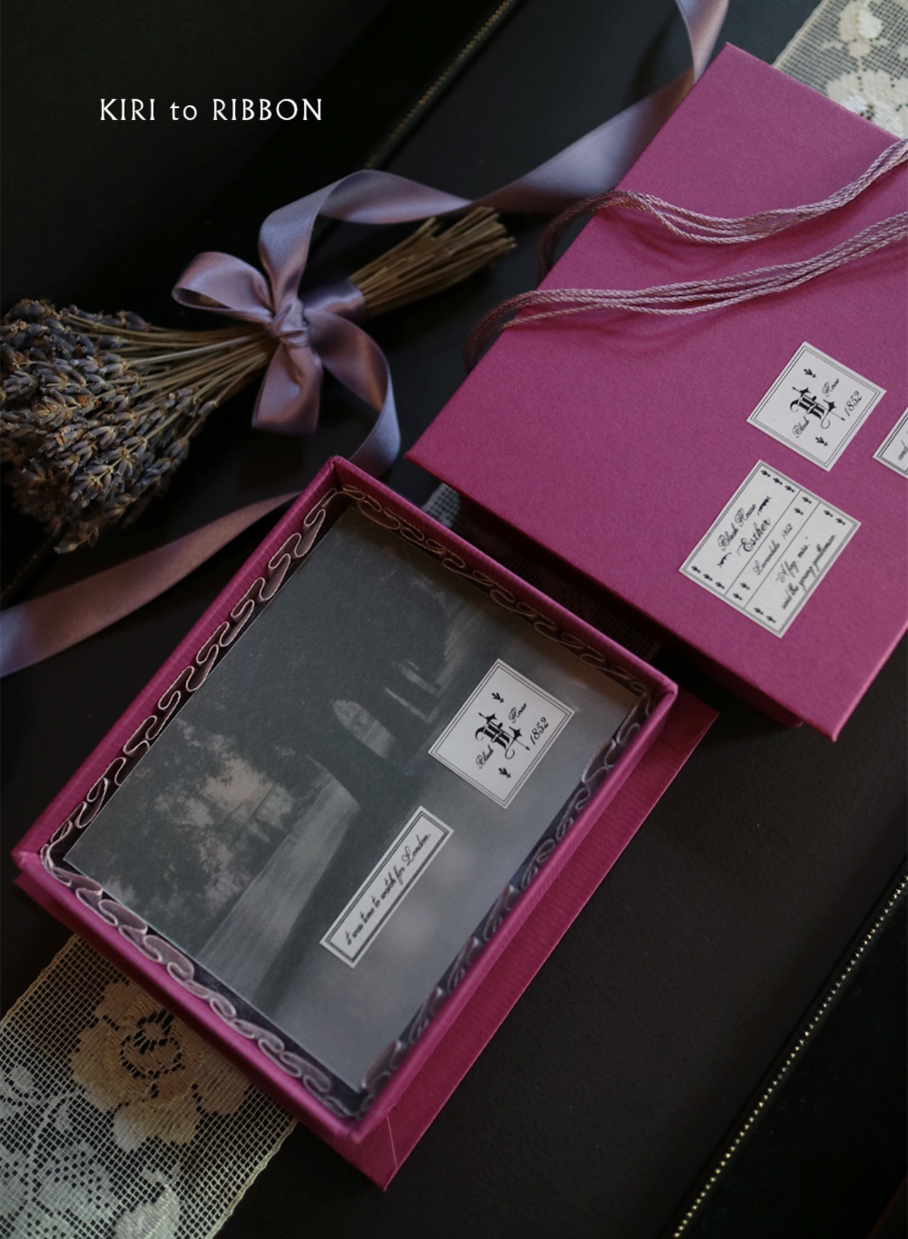 箱を開けるとトレーシングペーパーに刷られた荒涼館の情景が現れ、封入されているガラスの小壜が透けて、霧の風景を演出します。