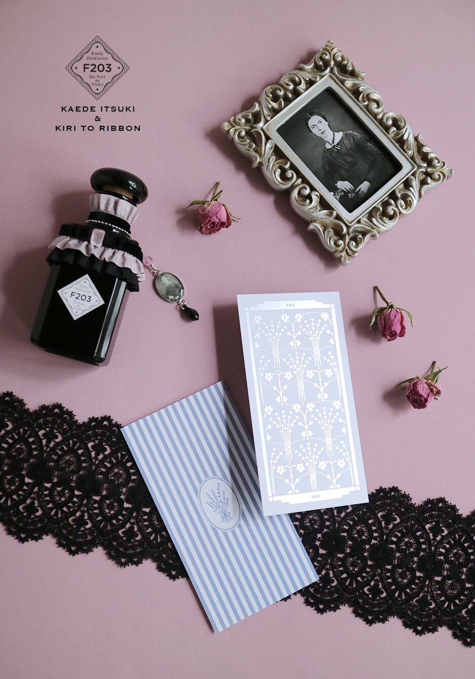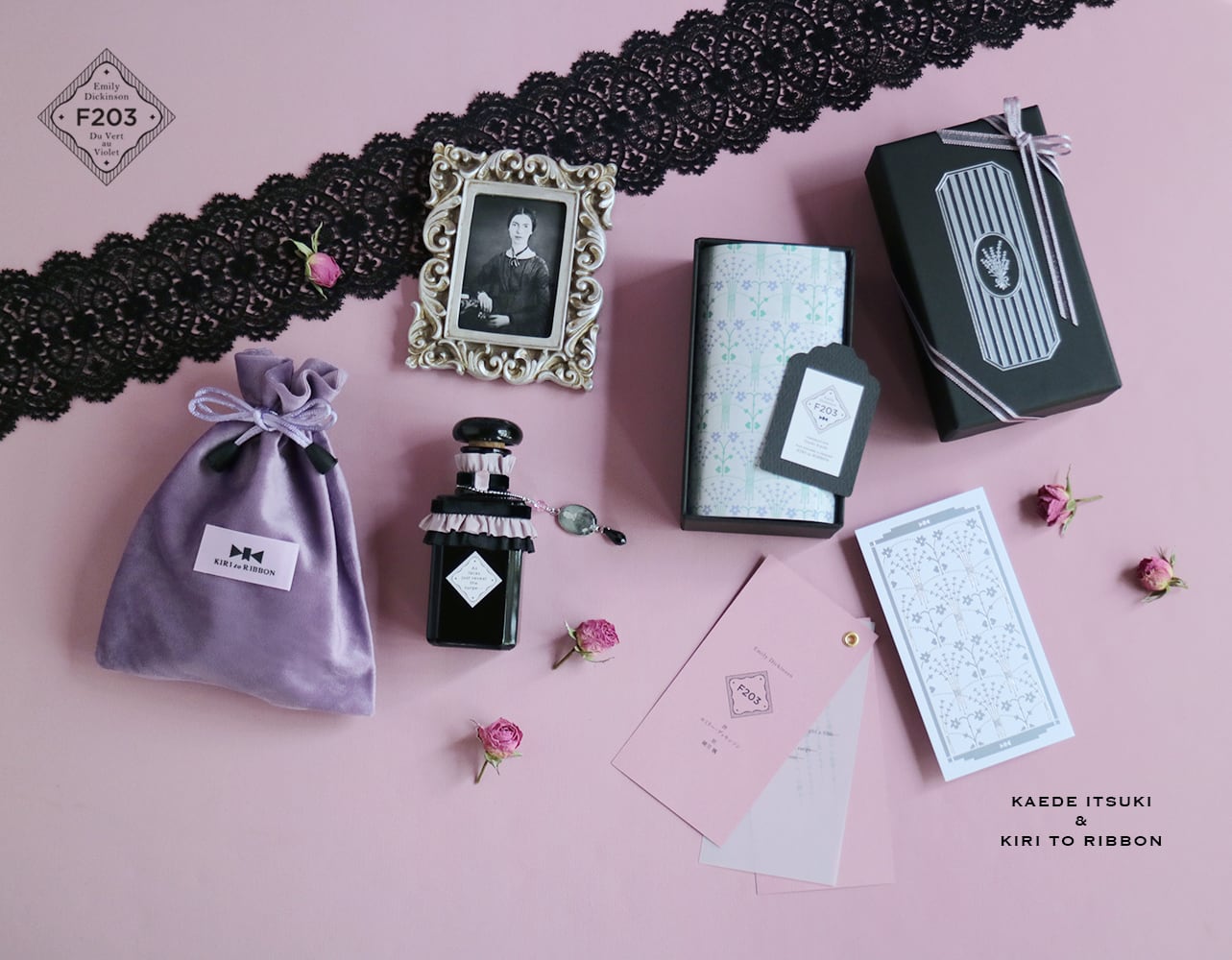 控えめな光沢のあるフリルオーガンジーとベロアリボンで装飾した漆黒の小壜に、エミリー・ディキンソンの肖像写真入り樹脂チャームとスワロフスキーが揺れます。