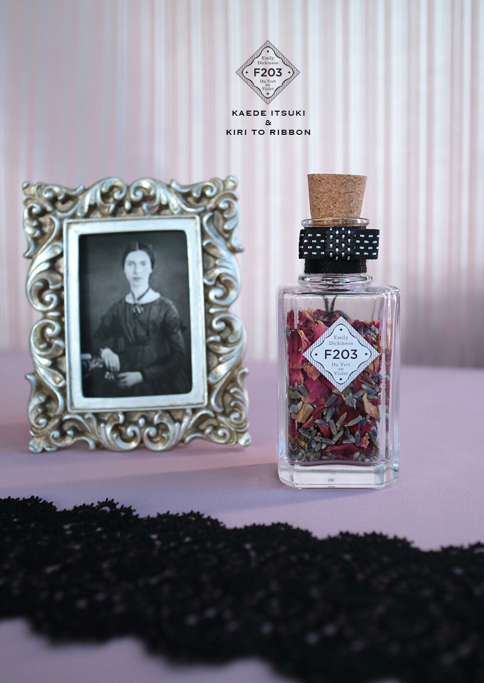 壜の裏側には題材となった詩の一節が貼付され、オリジナルの封蝋タッセルが揺れます(4枚目・14枚目写真)。両面を表側として飾ることができます。