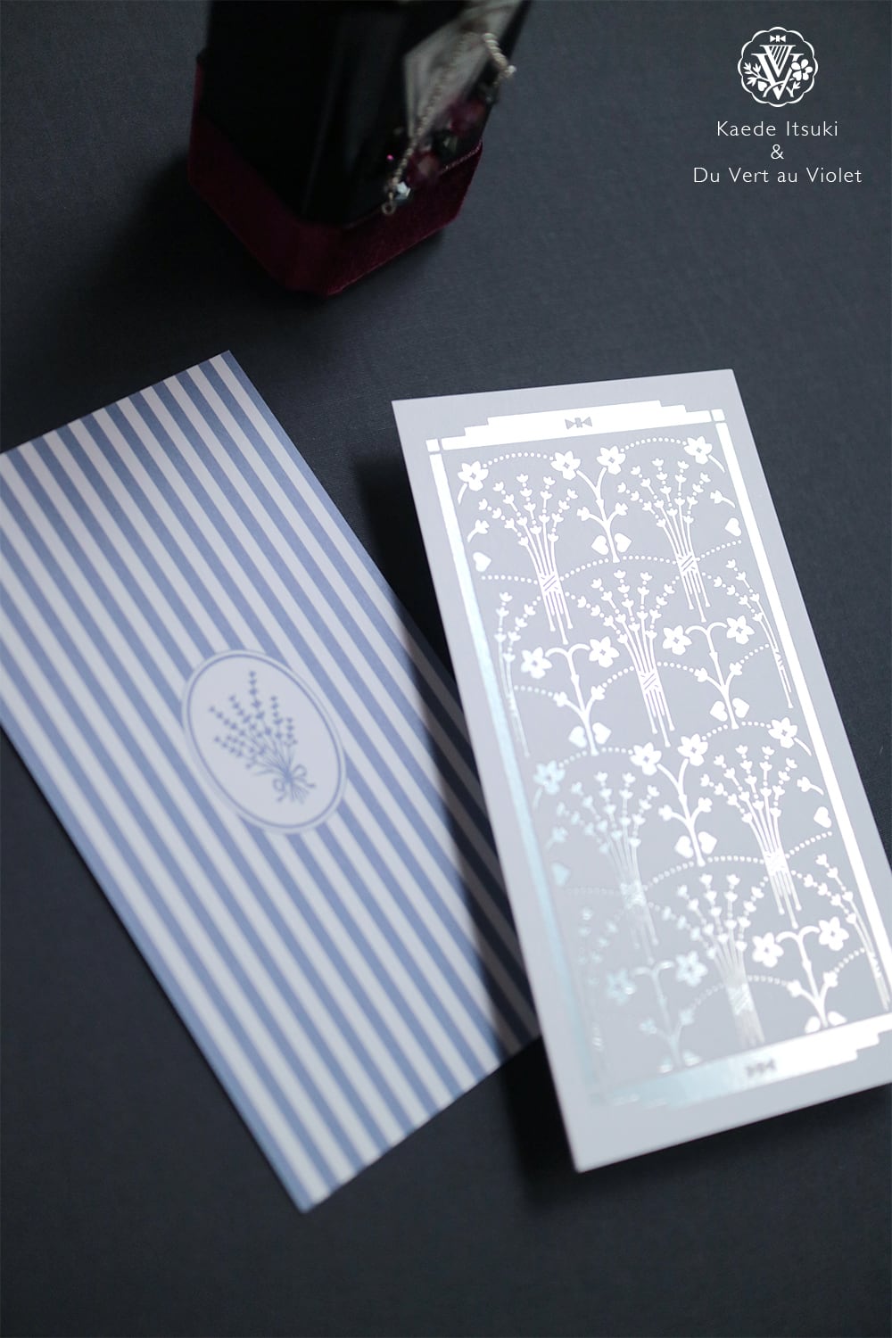 ペーパードイリーが付属します。片面が銀箔押し、もう一方が菫色ストライプ模様です(10枚目写真)。小壜の下に敷いてご活用下さい(2枚目写真)。