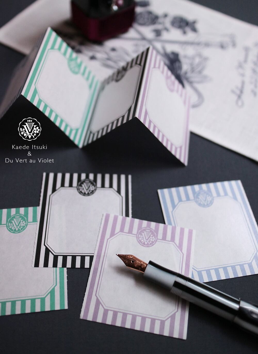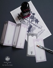 ミシン目で切り離せる薄紙のノートレット。色は薔薇色と黒色(13枚目写真)。ちいさな紙片の方は、薔薇色、黒色、菫色、アブサン色の4色(14枚目写真)。ノートレットは一筆箋としてもご活用下さい。