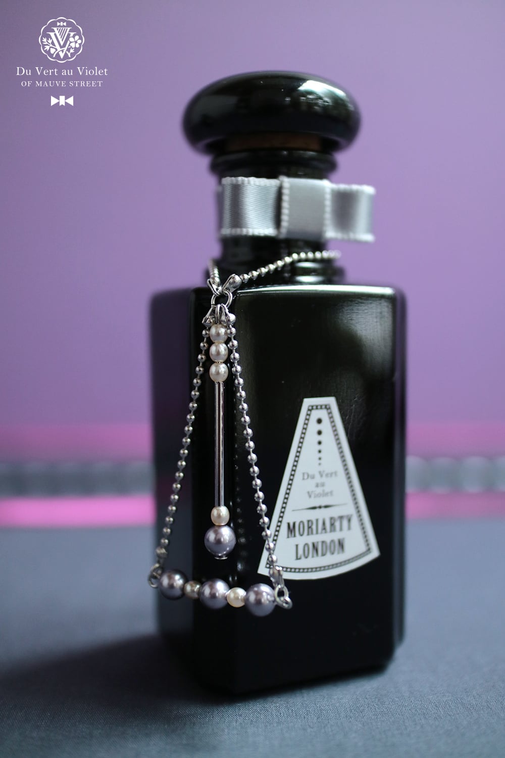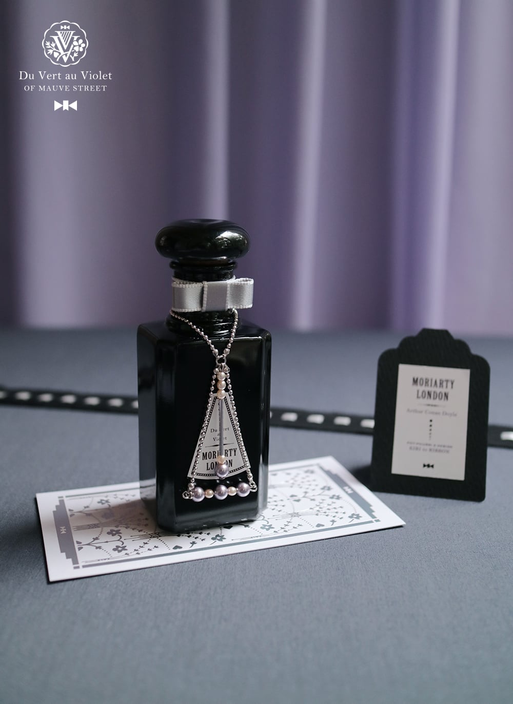 小壜はシルバーリボンと菫色&オフホワイトのスワロフスキーパールで飾って(4枚目写真)。モリアーティ教授の先鋭を写したアールデコ調ラベルの上をスワロフスキー・チャームが揺れます。スワロフスキー・チャームは横にずらしても素敵になりますので、位置を変えてお楽しみ下さい(5・6枚目写真)。