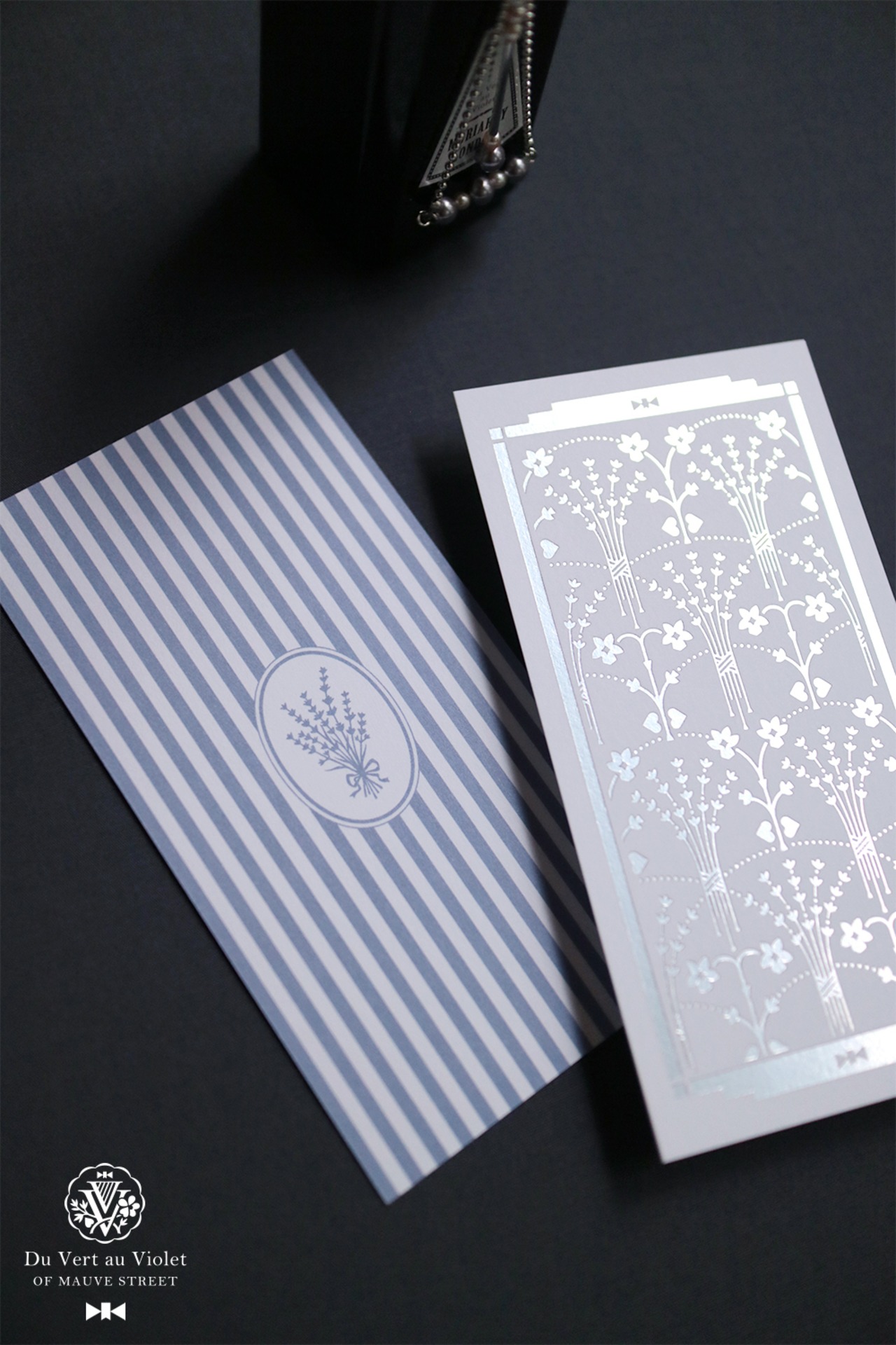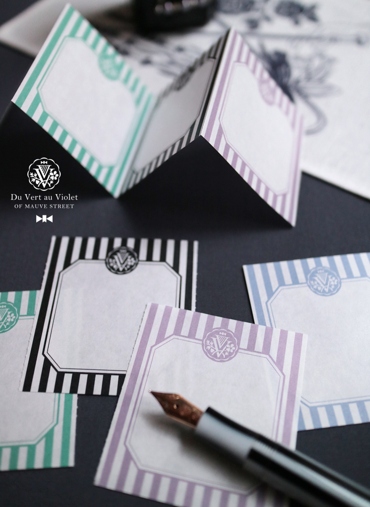 ミシン目で切り離せる薄紙のノートレット。色は霧とリボンの基調色の菫色とアブサン色(13・14・18枚目写真)。ちいさな紙片の方は、薔薇色、黒色、菫色、アブサン色の4色(15・17枚目写真)。ノートレットは一筆箋としてもご活用下さい。