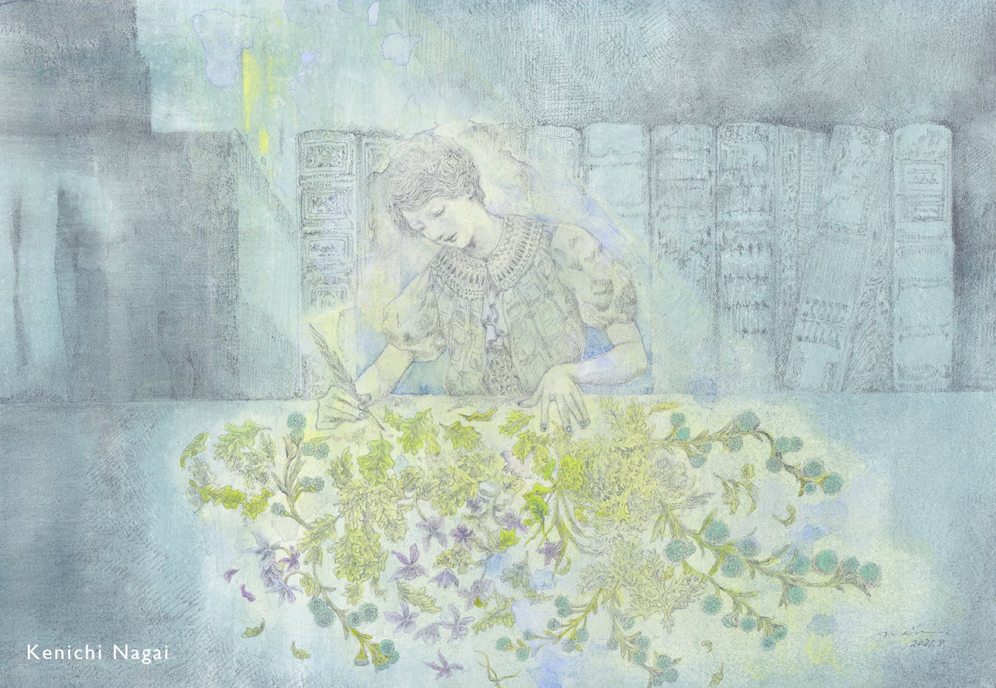 永井健一が描く作品は、孤独と文学を愛する精神のしっとりとした静寂で満たされている。