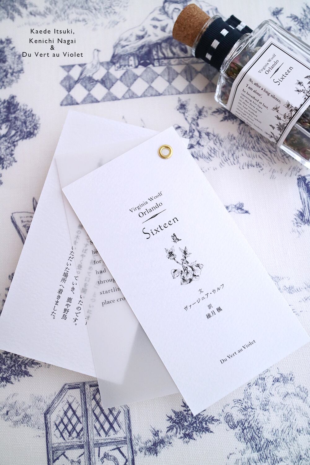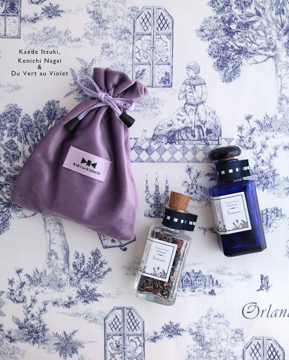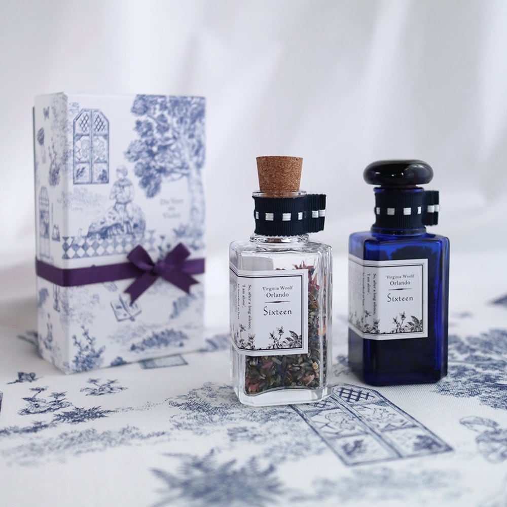 小壜は少年オーランドーの憂鬱を写したブルーとポプリが覗く透明壜の2種。ガラス壜の三面に渡るラベルには、永井健一さまの絵画と共に、題材となった原文も刷られています。