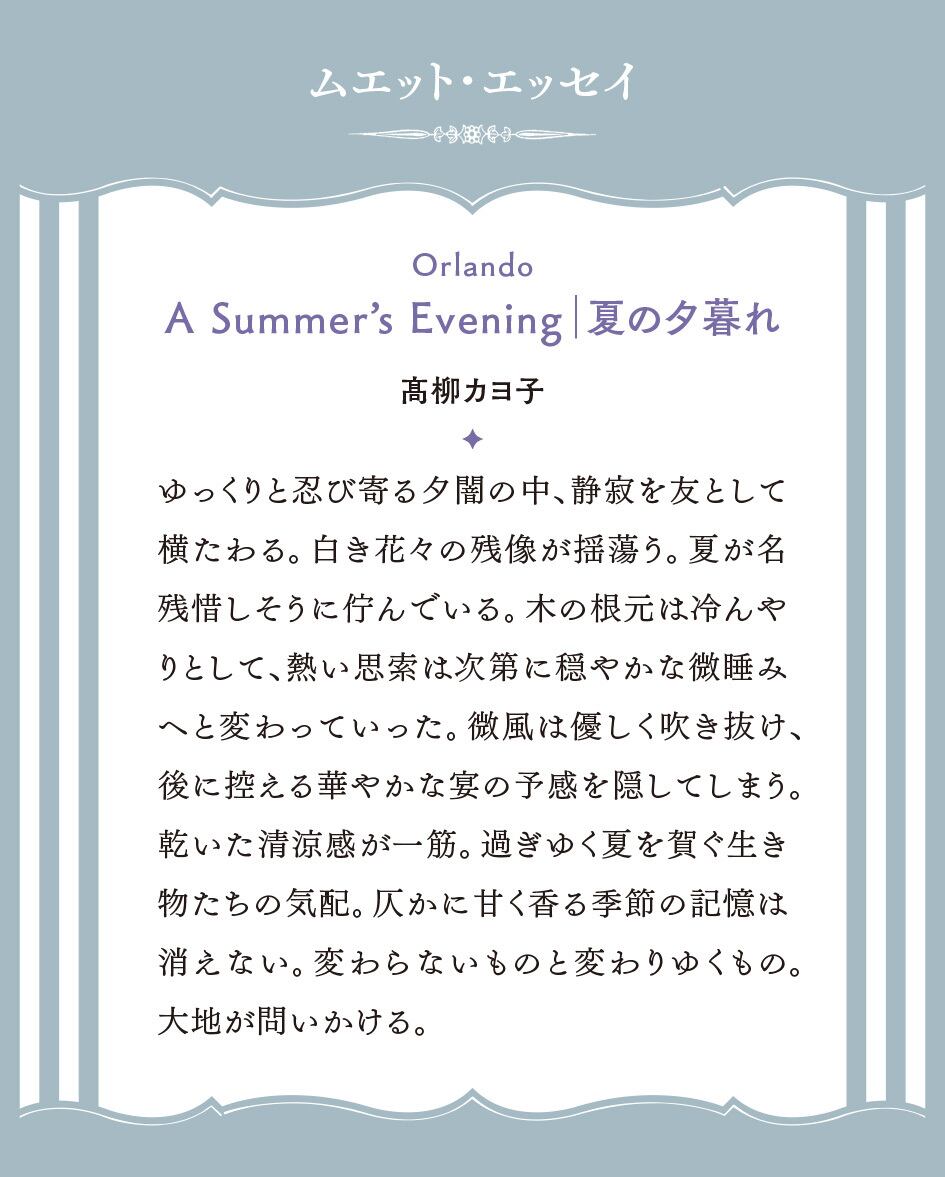 楢の木に漂う心をくくりつけ横たわると、彼の内側と周囲にあったはためきはひとりでに静まっていきました。宙づりになった木の葉、鹿は歩みを止め、淡い夏の雲も留まる。手足は重たく大地に沈み込みました。あまりにじっと寝転んでいたので、次第には鹿が近くに足を進め、ミヤマガラスは輪を描き、ツバメは急降下して旋回し、トンボはぶんと掠め飛びました。まるでなまめかしくも豊かな夏の夕暮れ時の営みの全てが、蜘蛛の巣のようにオーランドーの身体を織り込んだように。