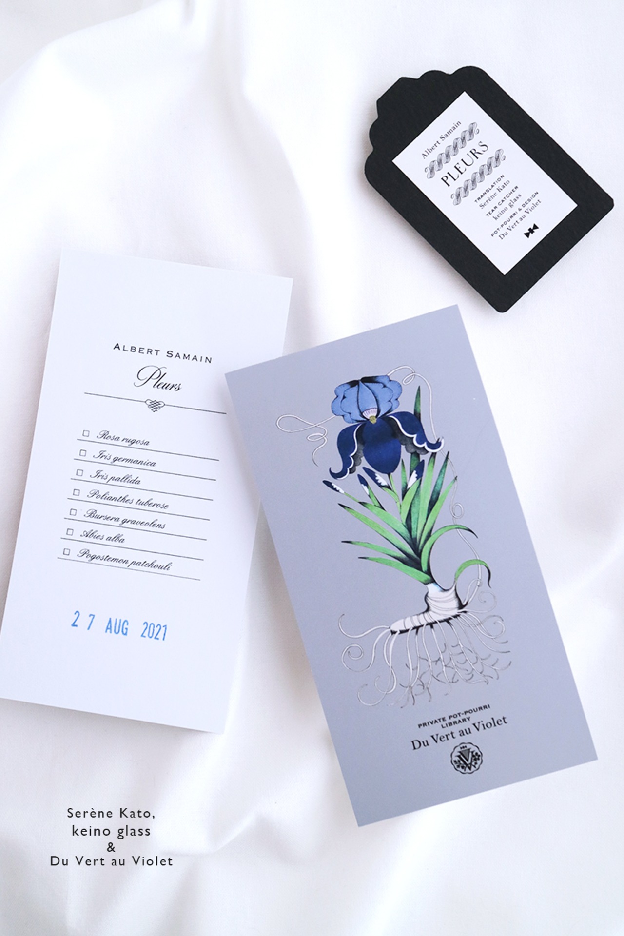 書物を紐解くように香りと対話する、Du Vert au Violetのプライヴェート・ポプリ。訳詩やガラスに触れながら、五感を研ぎ澄ます豊かなひとときをお過ごし頂けましたら幸いです。