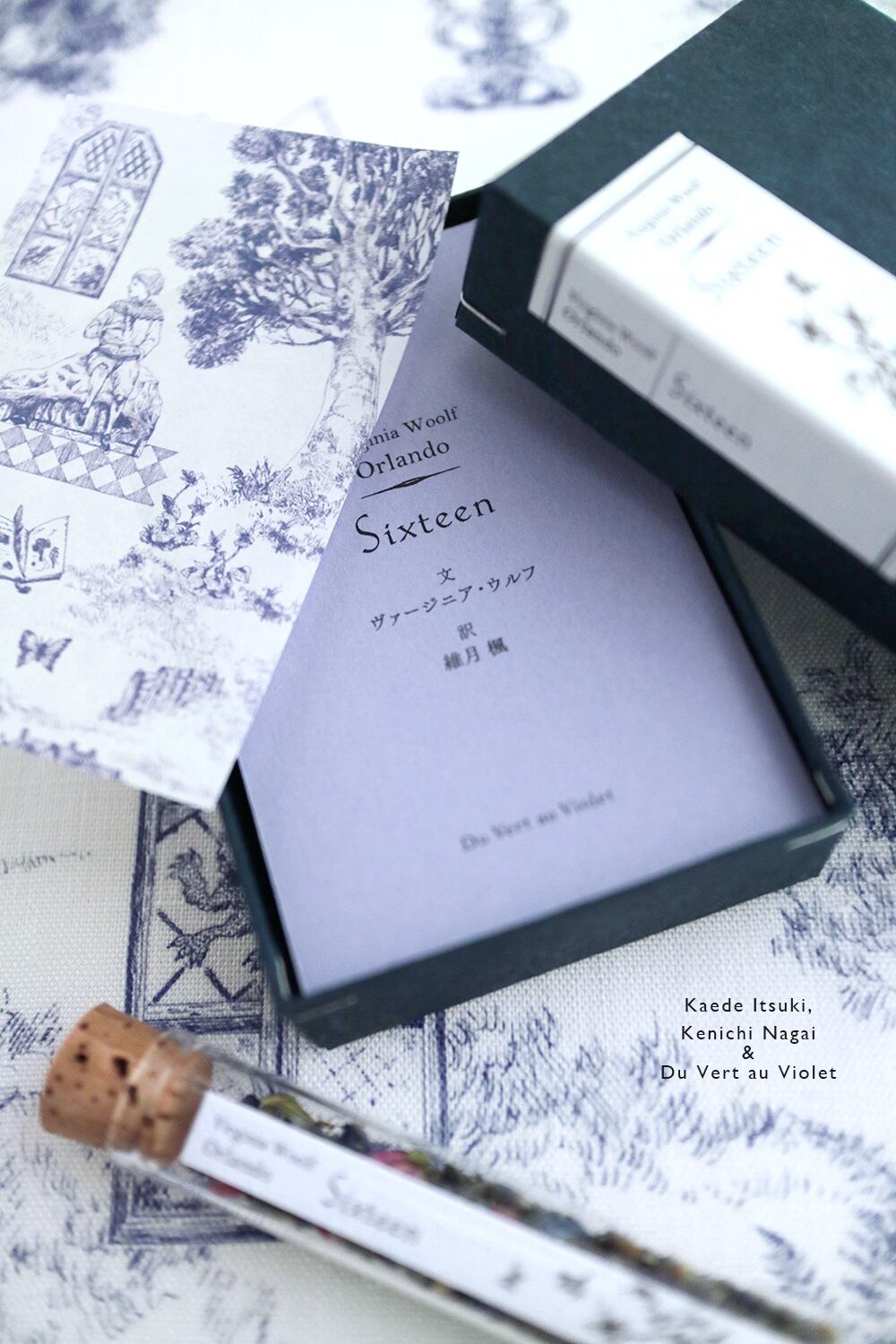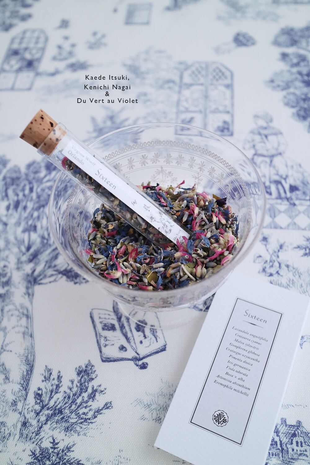 台紙には、配合したハーブ類の学名が記されています。少年オーランドーに伴走する維月 楓さま翻訳の一節と共に馨しいひとときを。トワル・ド・ジュイのミニカードも6枚付属。栞や蔵書票、一筆箋としてご活用下さい。
