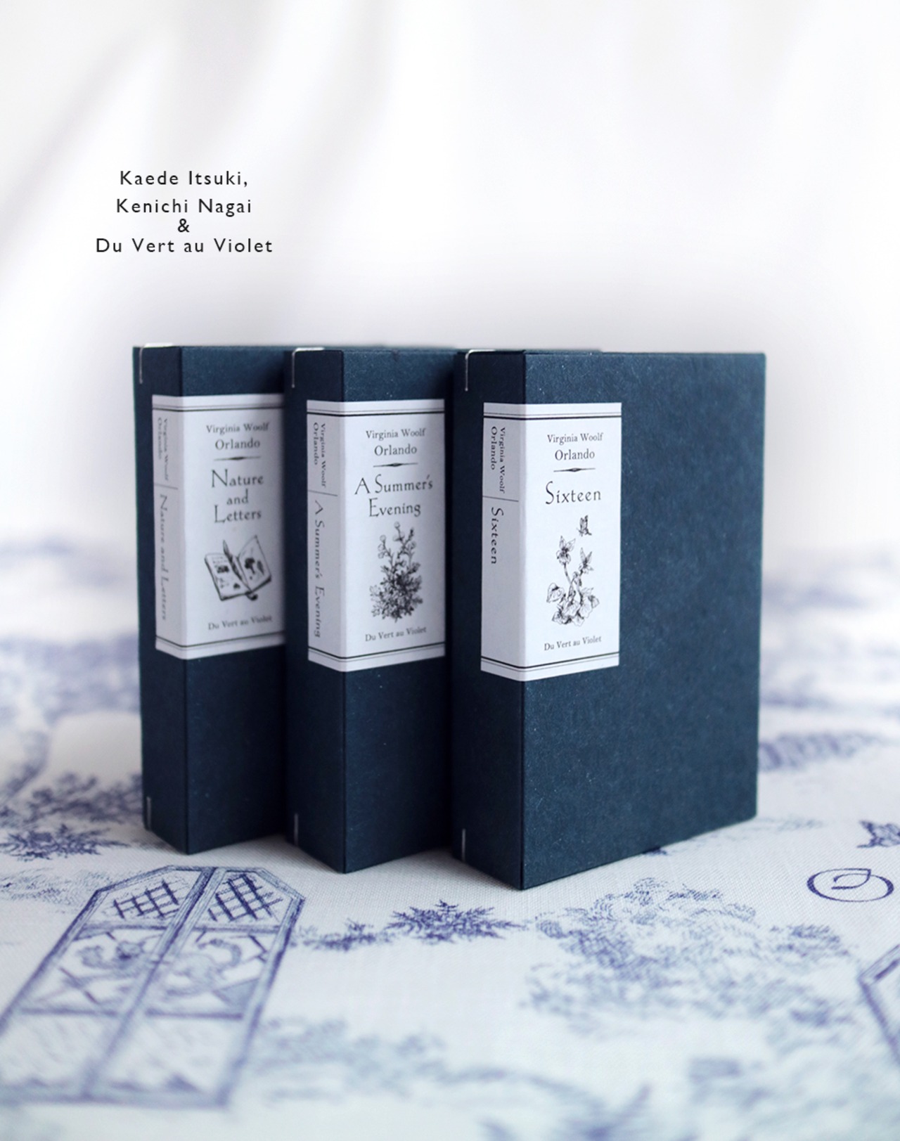 永井健一さまの原画を構成したトワル・ド・ジュイを印象的に配置。ボックスは書物のシリーズ装丁のように。背表紙が並ぶと、ちいさな香りの書架がお部屋にやってきたかのよう。