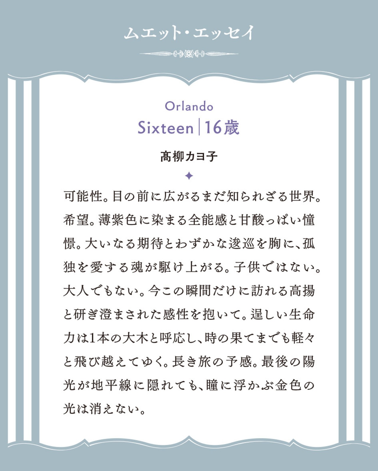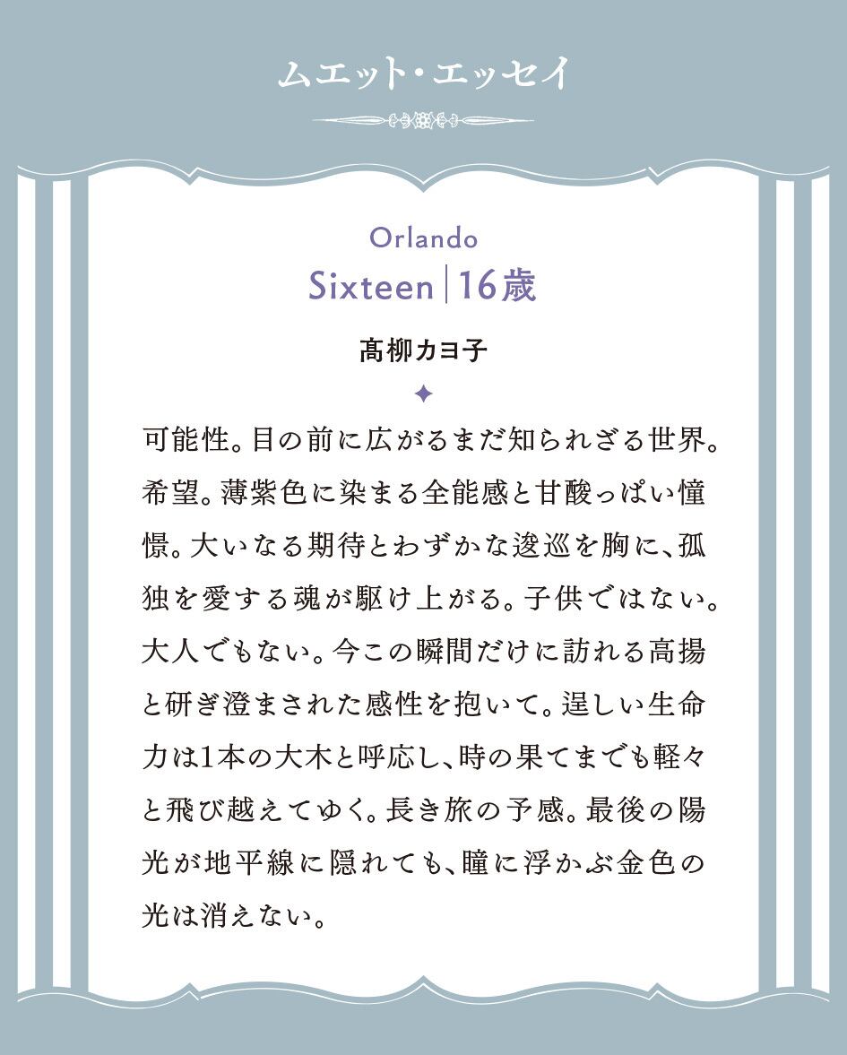 オーランドーの繊細な少年性を菫色に託した「Sixteen|16歳」。ポプリは少年性を託したヴァイオレットリーフが印象的な、青菫色が駆け抜ける瑞々しく甘やかな香りです。